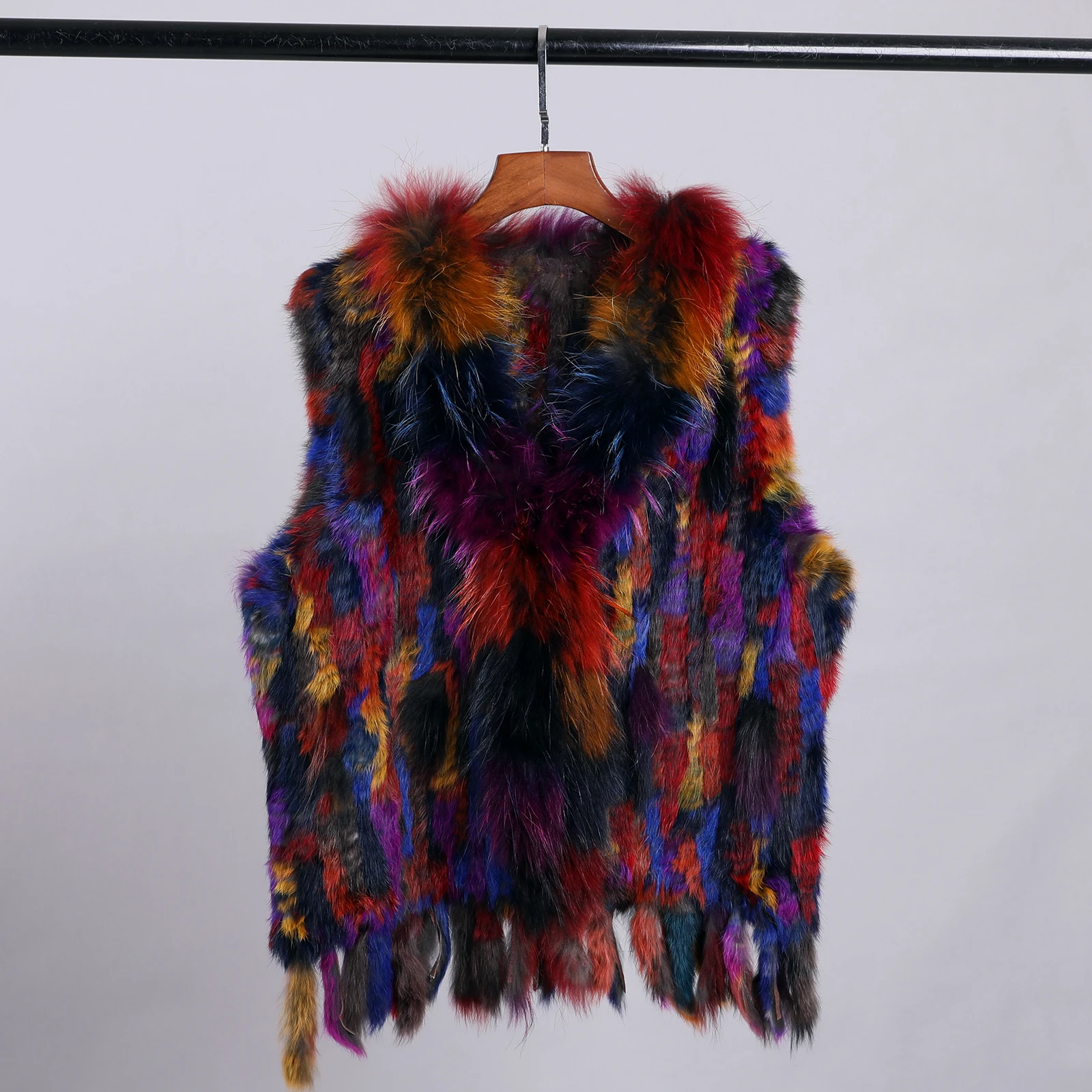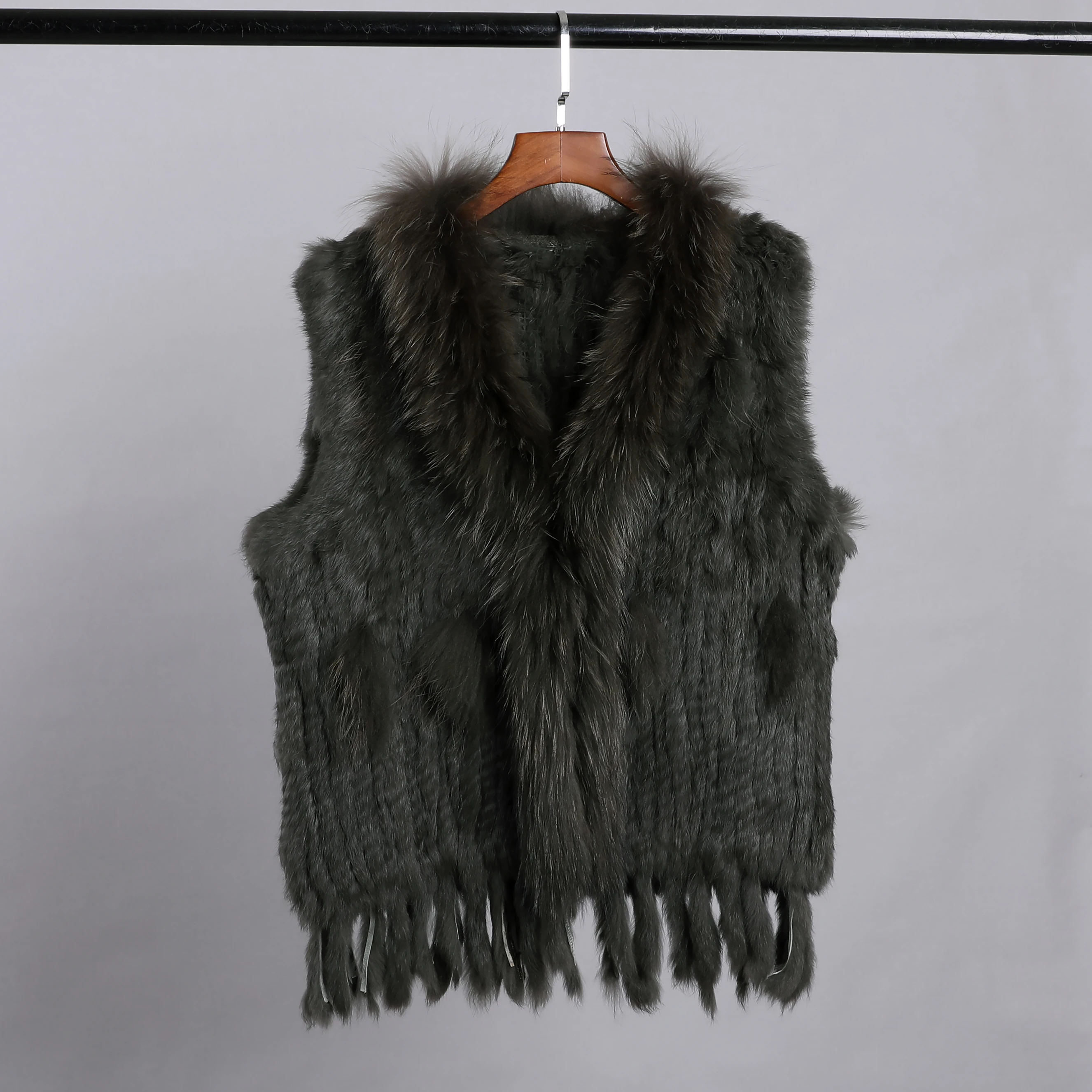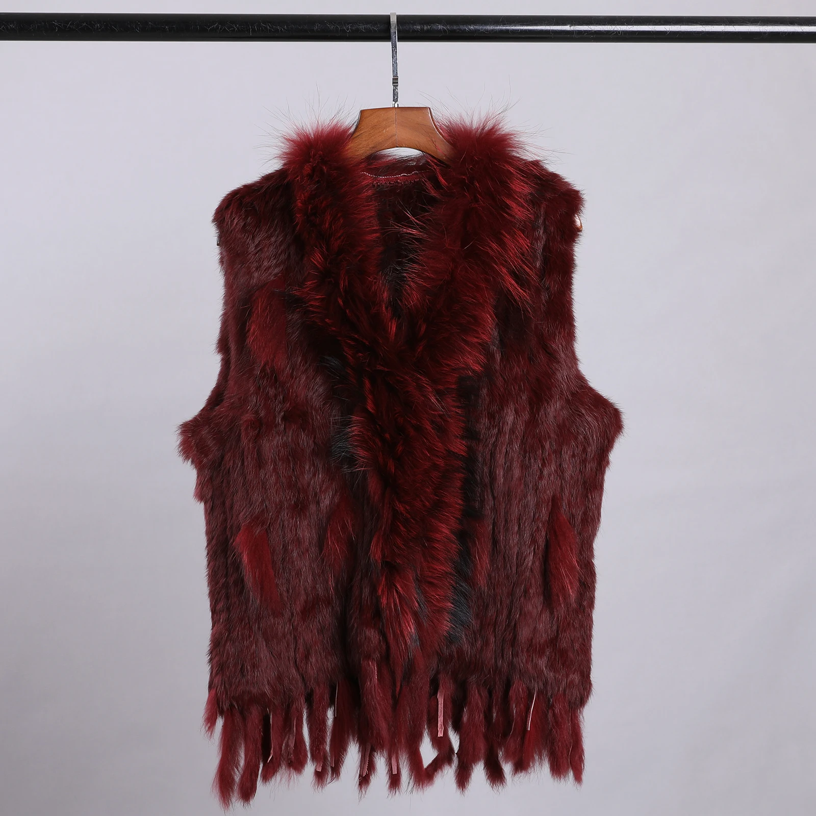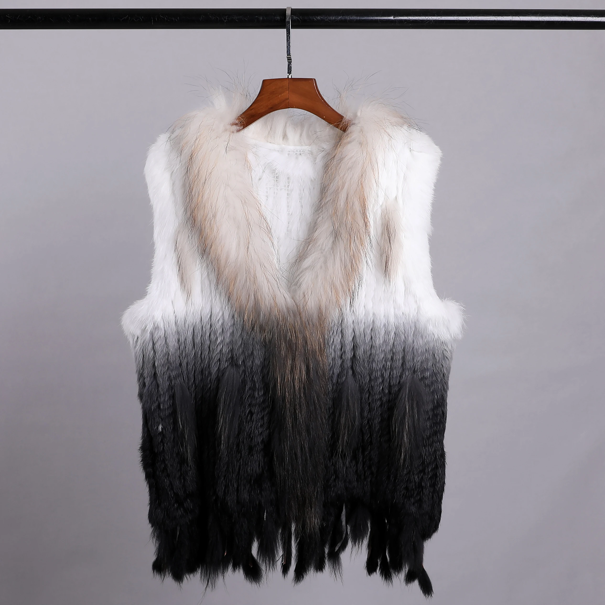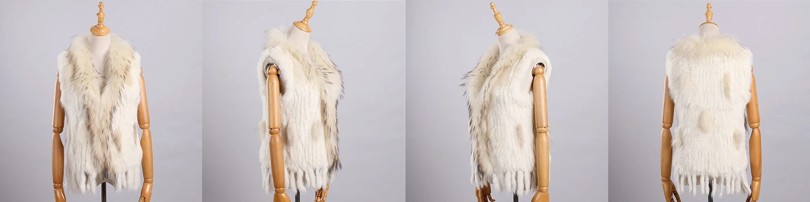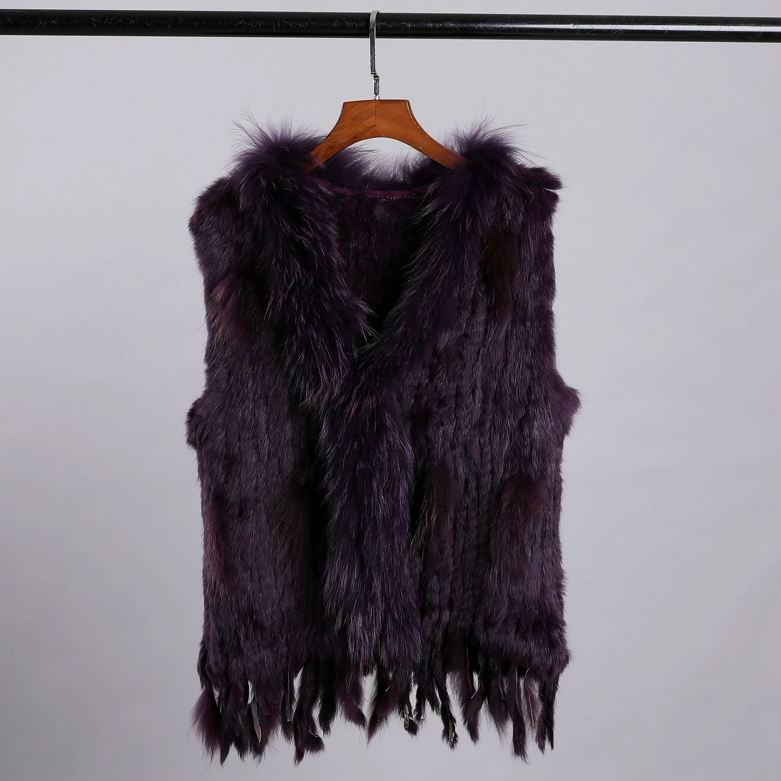 Color: Champagne, Size: XL - Luxury Women's Genuine Premium Long Hair Rabbit Fur Knit Vest Raccoon Fur Trim Gilet Lady Sleeveless Waistcoat Real Fur Jacket