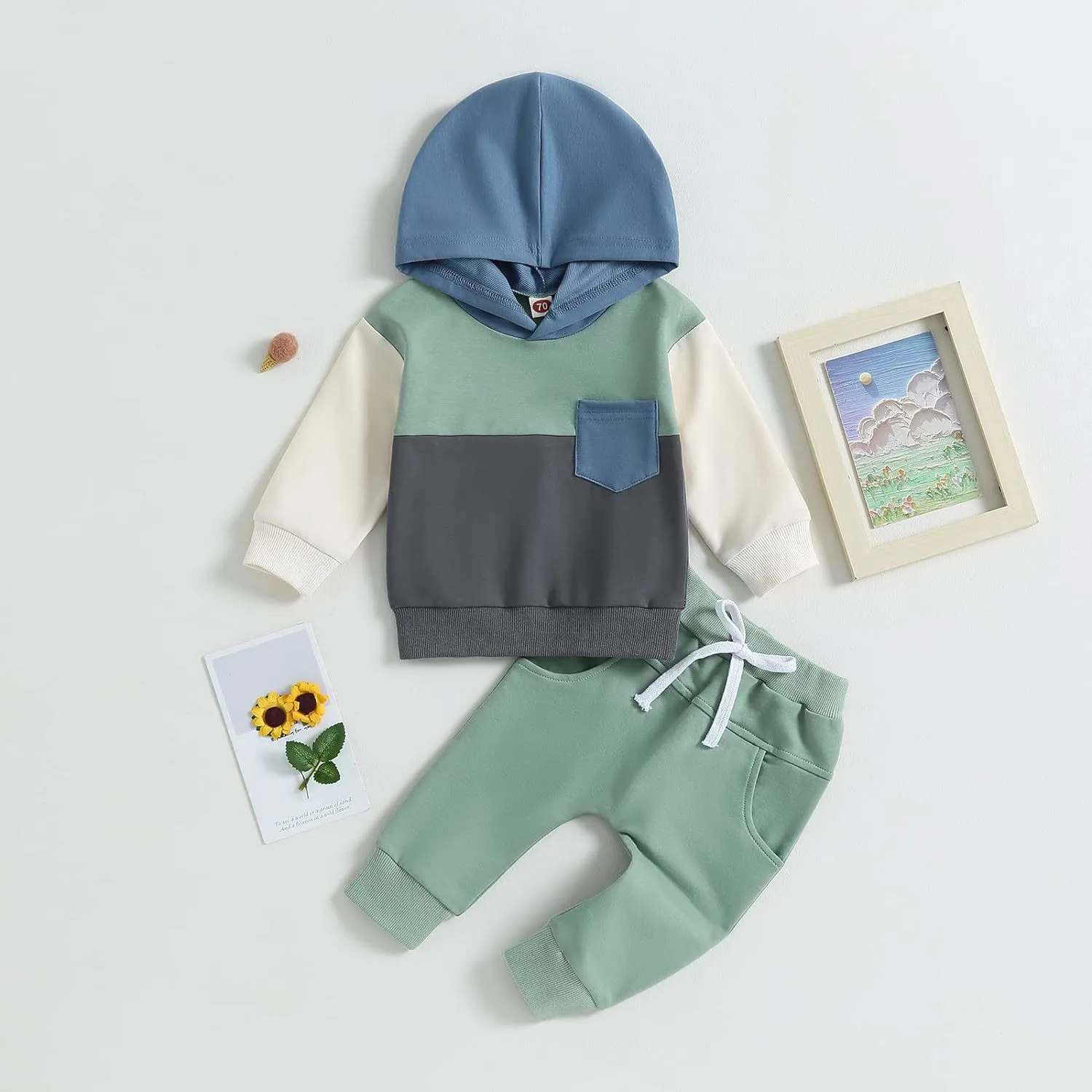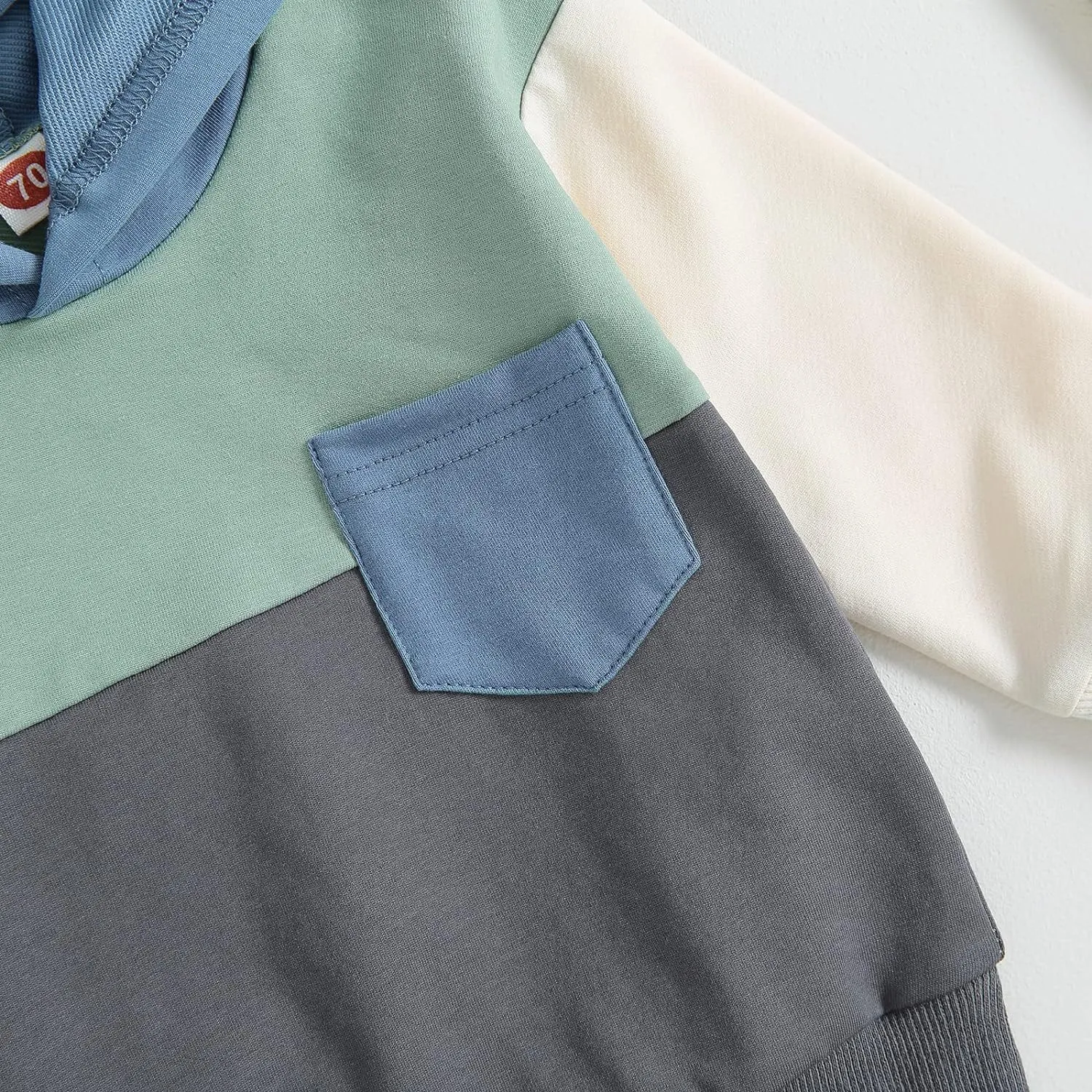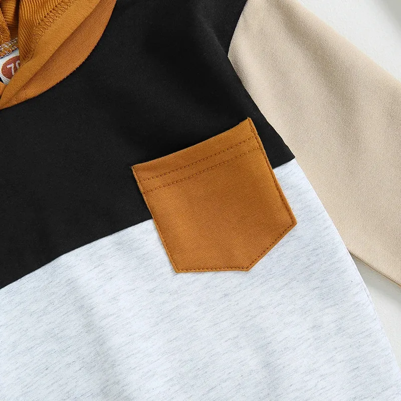 Color Contrast Patchwork Pocket Hooded Sweater Children Fashion Casual Set