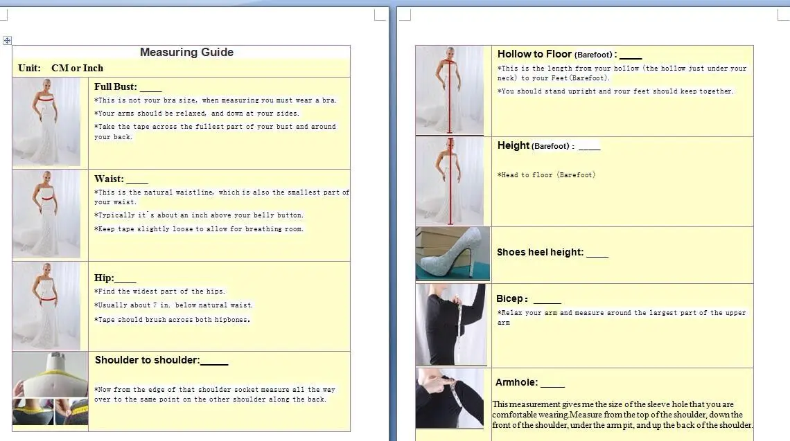 Because our dresses are custom made,it will be better if you could provide us the following sizes: