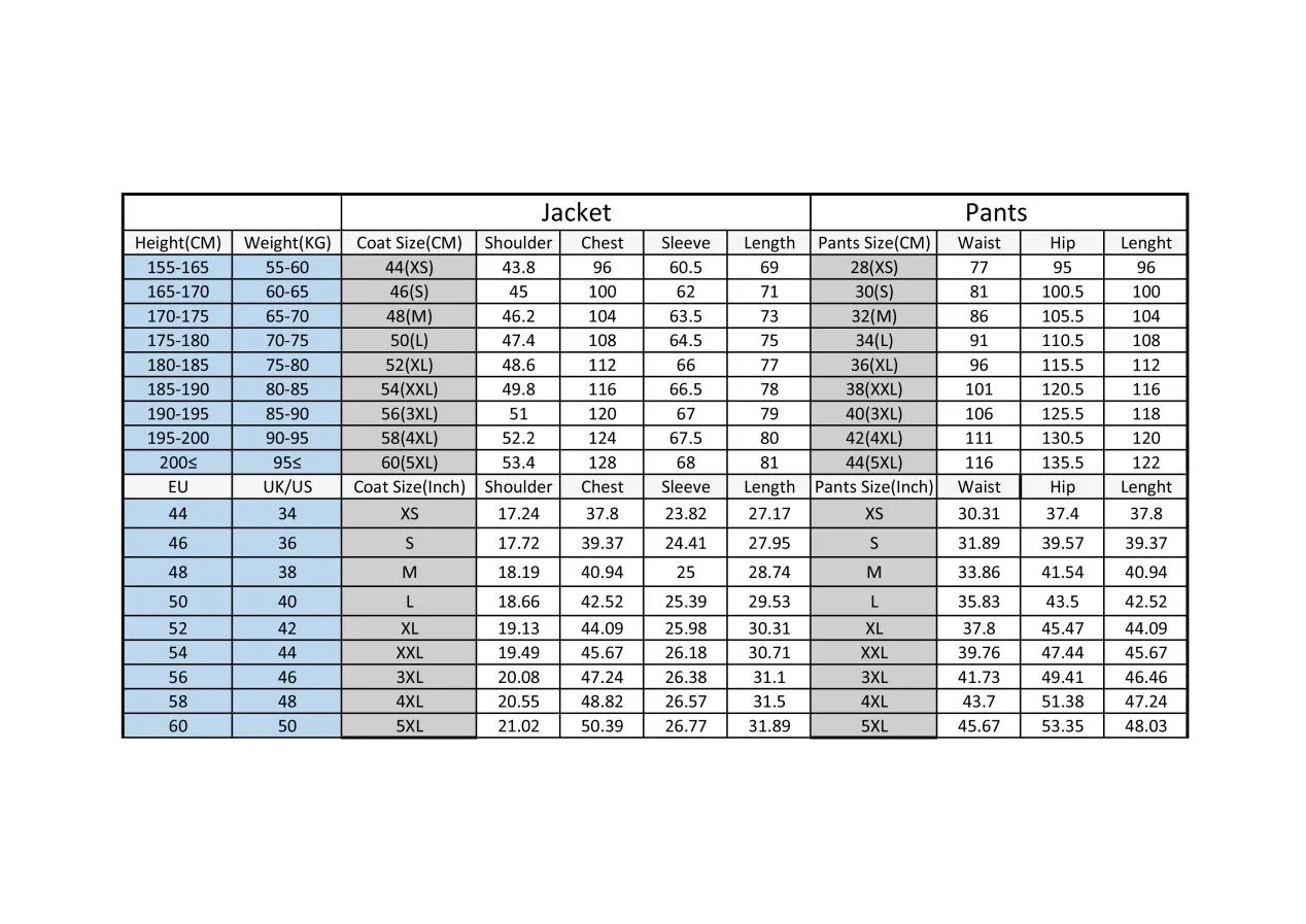 Please give us your exactitude sizeand color when placing an order, We are very happy to process returns when necessary , in order to make the suit very fit with you . Please provide Height and Weight with the measurements of Bust and Waist, and also please tell us the size that you usually wear.Different sizes of jacket and trousers are available!