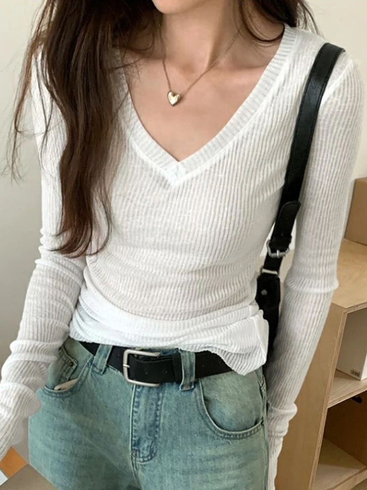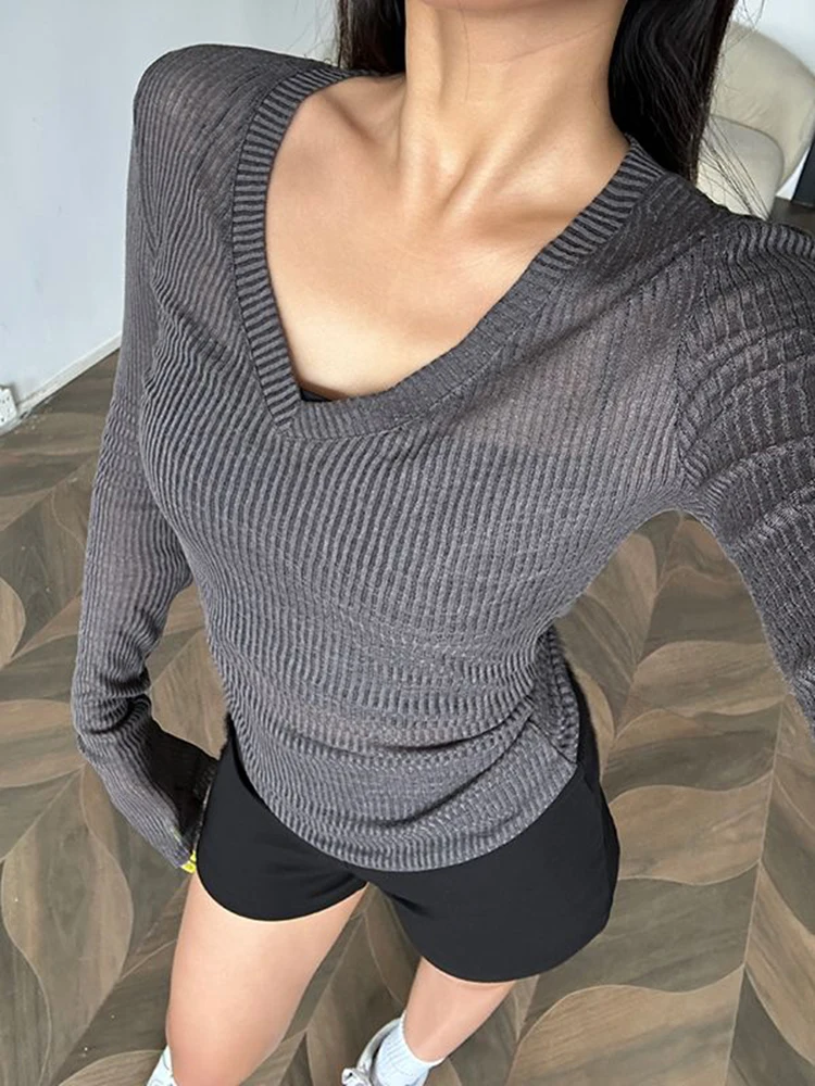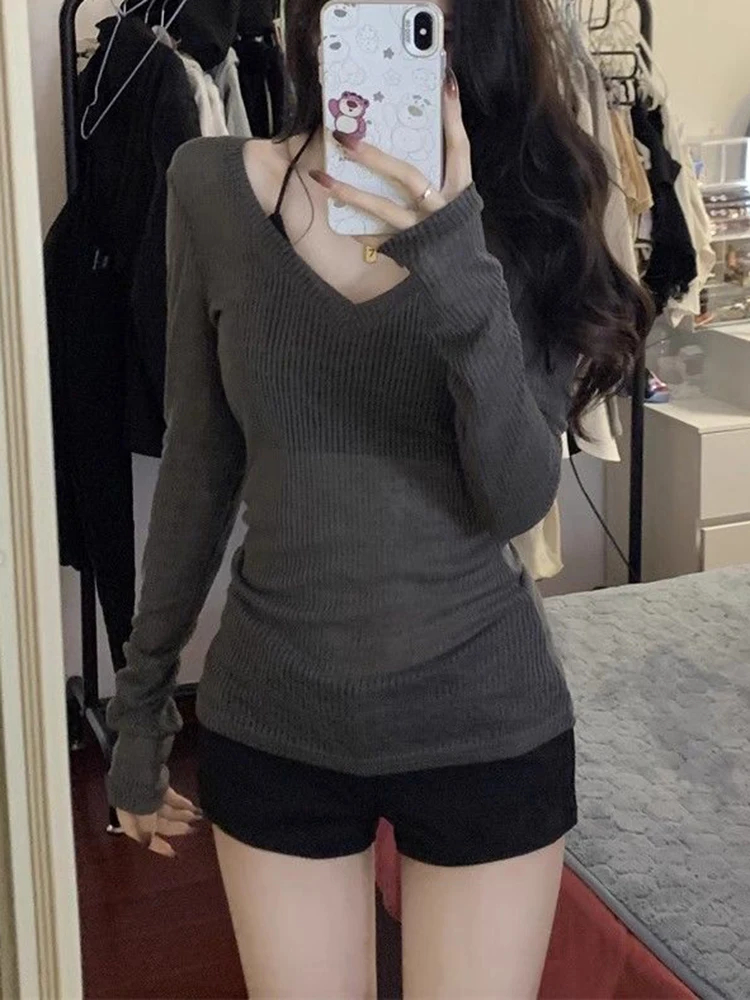 Color: Dark Grey, Size: L - Women Long Sleeve T Shirt Thin Perspective Summer Solid Slim Casual Shirts Female Pullovers Basic Tee Y2k Clothes Streetwear Top