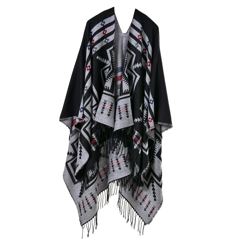 Color: Dark Grey, Size: One Size, Ships From: CHINA - European American Popular Tassel Thickened Cashmere Like National Style Travel Fork Shawl Scarf in autumn Ponchos Capes