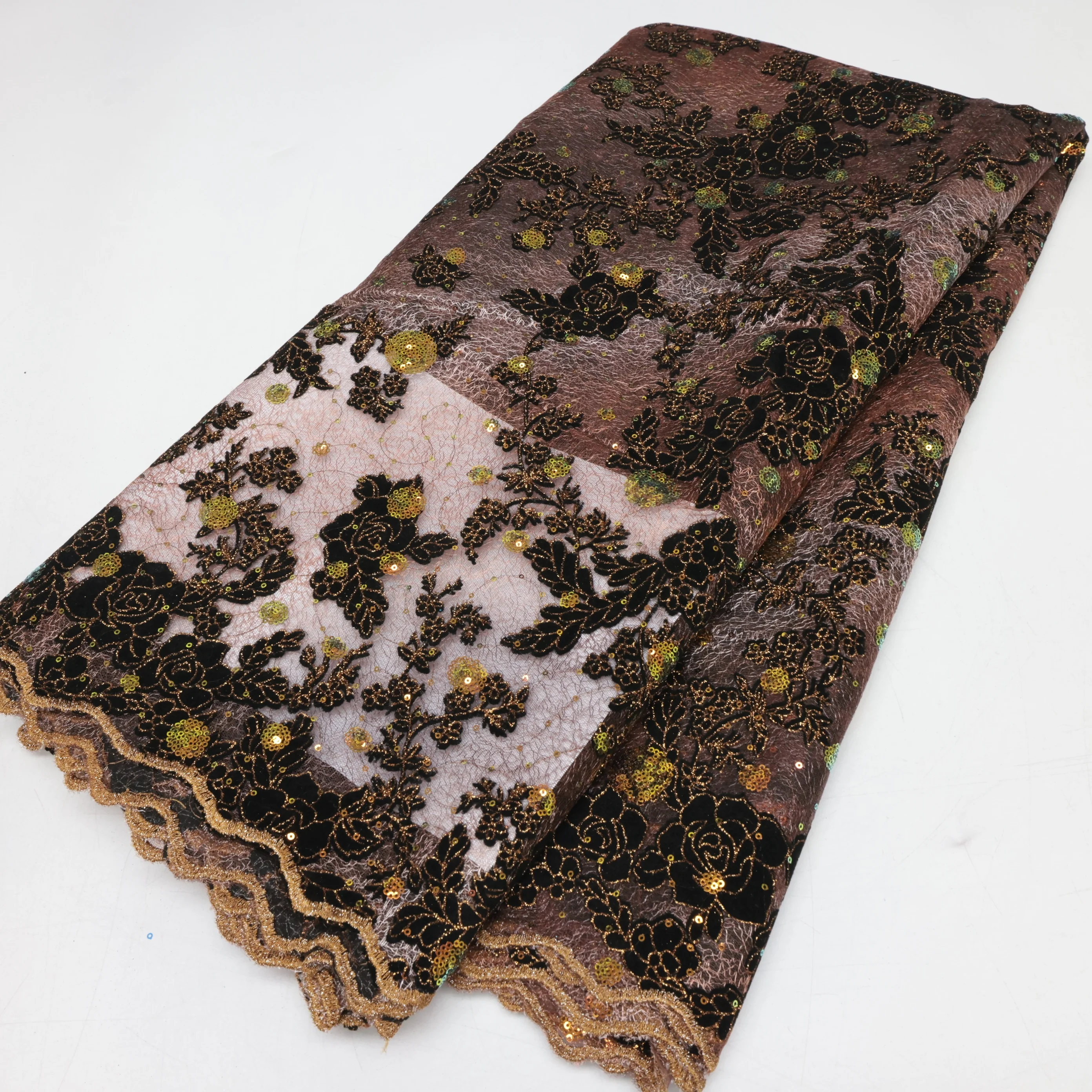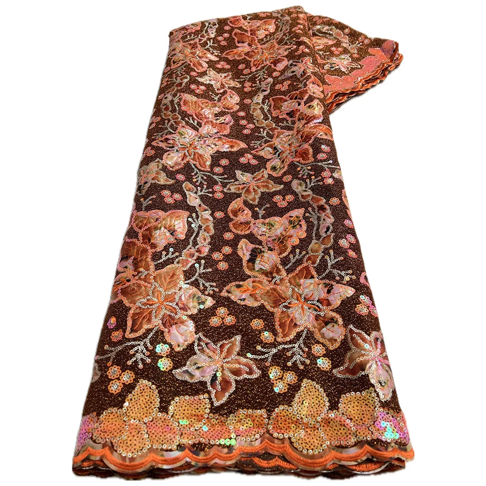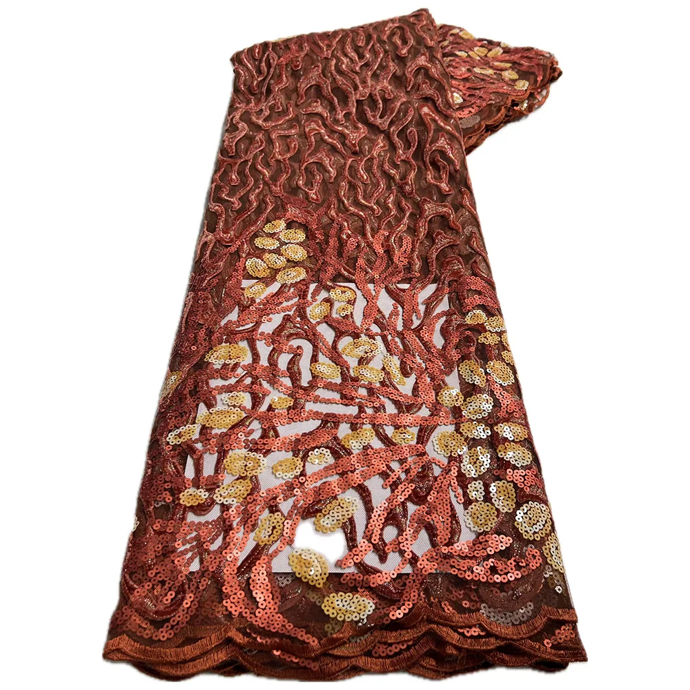 Color: Ginger, Length: 5 yards, Width: 120cm - 2025 African Nigerian Tulle Lace Fabric Sequins Sewing Guipure Beads Stone Embroidery Dresses High Quality 4 Yards