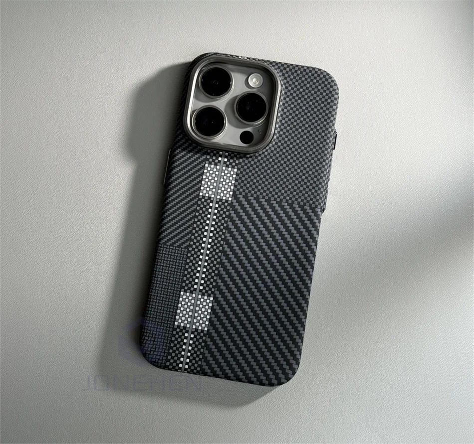 Color: Gold, Material: Nylon - Luxury Alloy Lens Personalized Pixel 3D Relief Carbon Fibre Pattern Case For iPhone 13 14 15 16 Pro Max Slim Cover For Magsafe