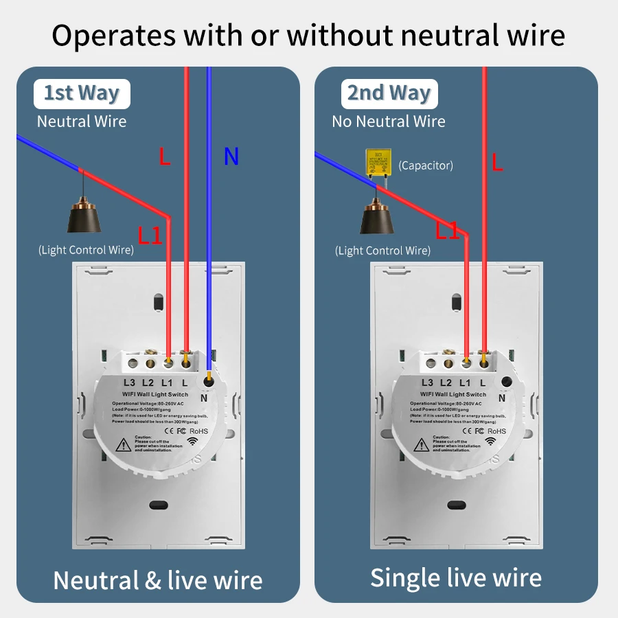 This switch are universal (1. They can be used with neutral wire; 2. They can also be used without neutral wire). There are two wiring methods: