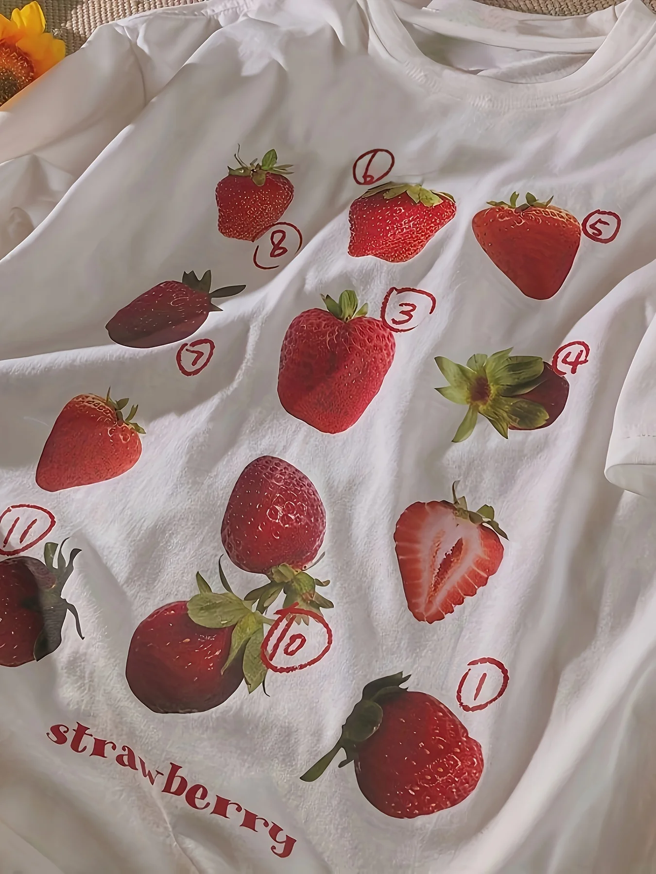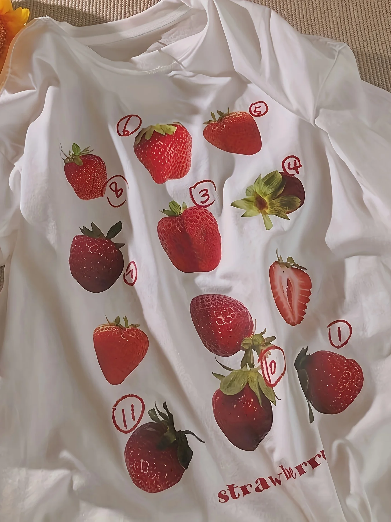 Color: Gold, Size: L - 100% Cotton Women T-shirt Cute Fresh Strawberries Printed Tee Shirt Summer Comfortable Loose Tops Street Fashion Female Clothes