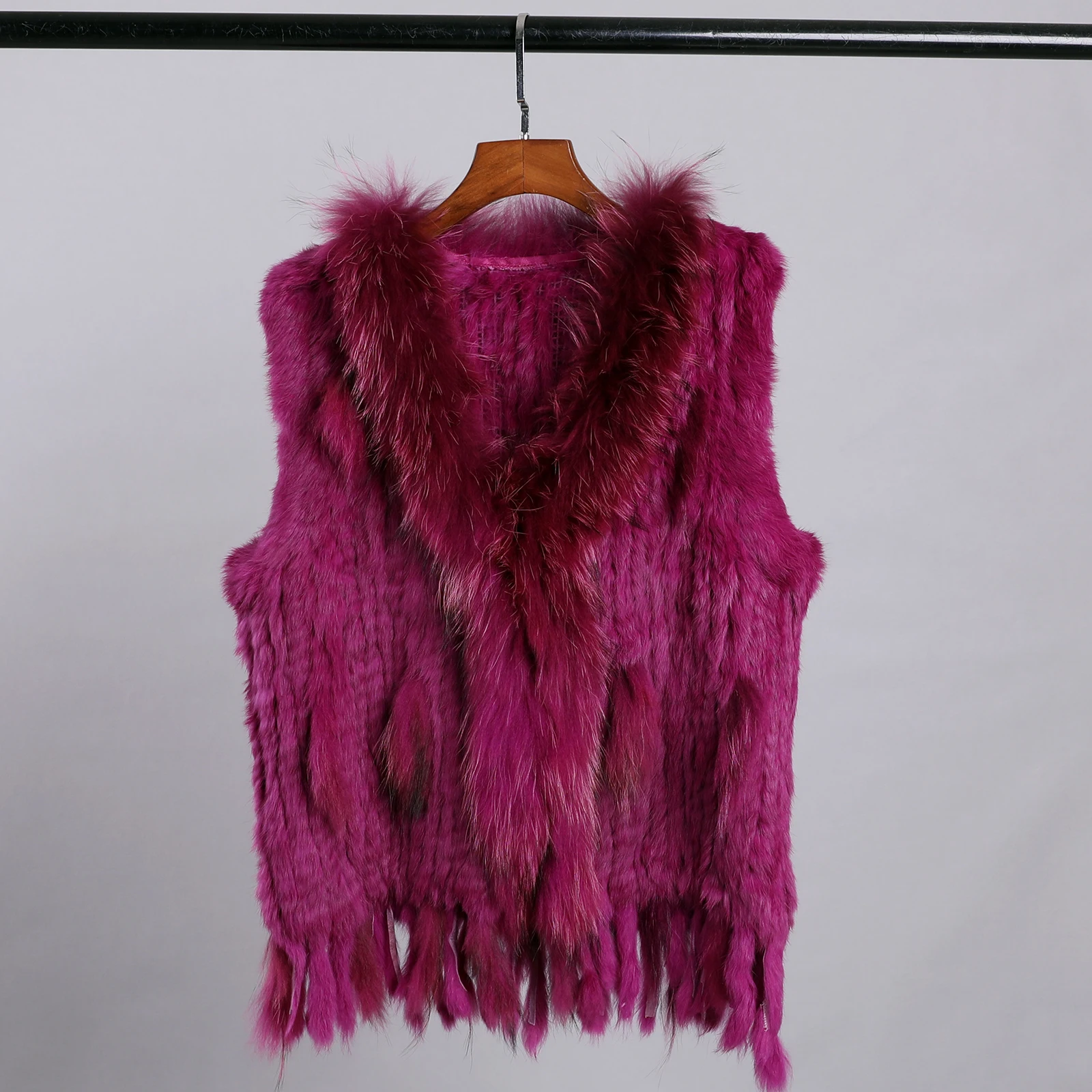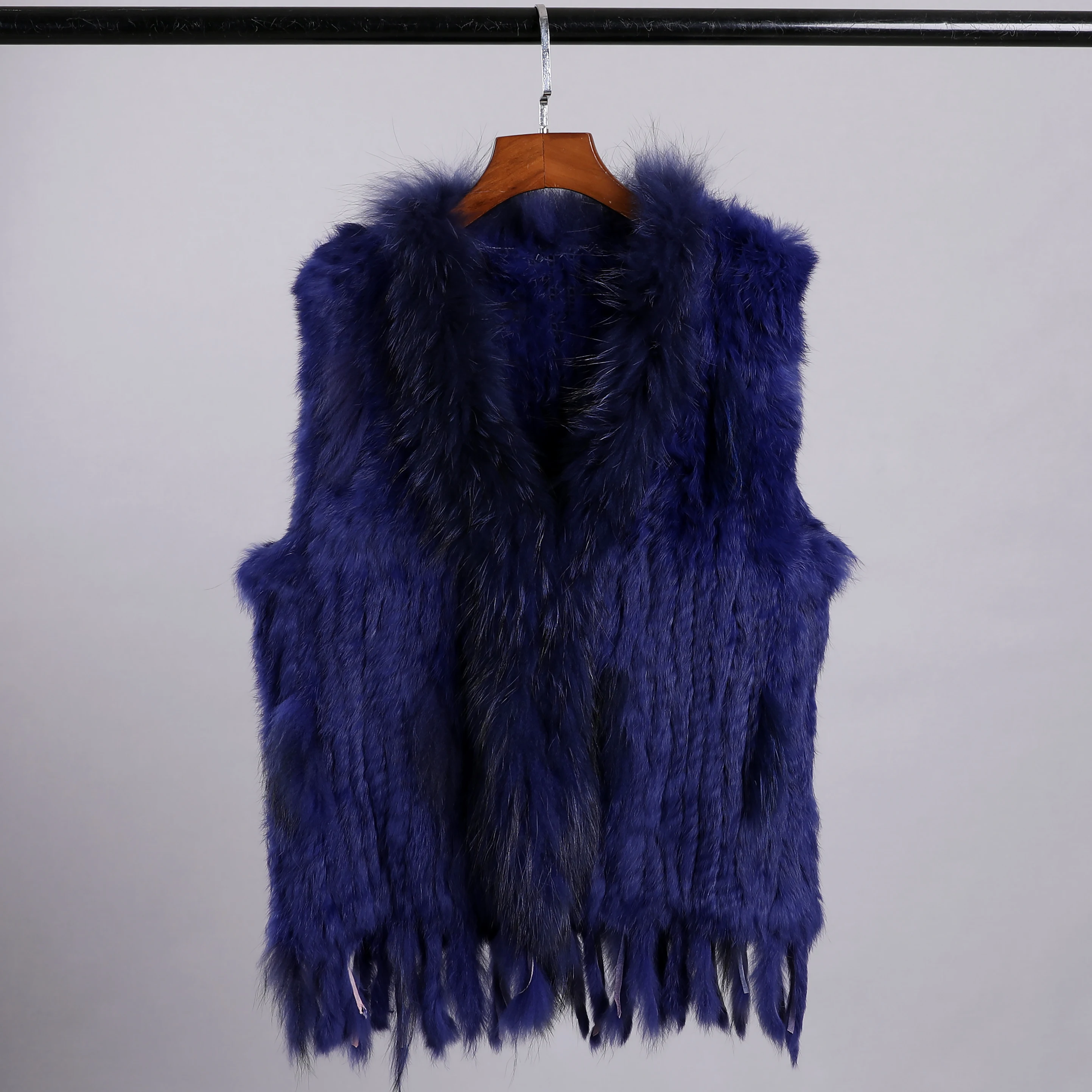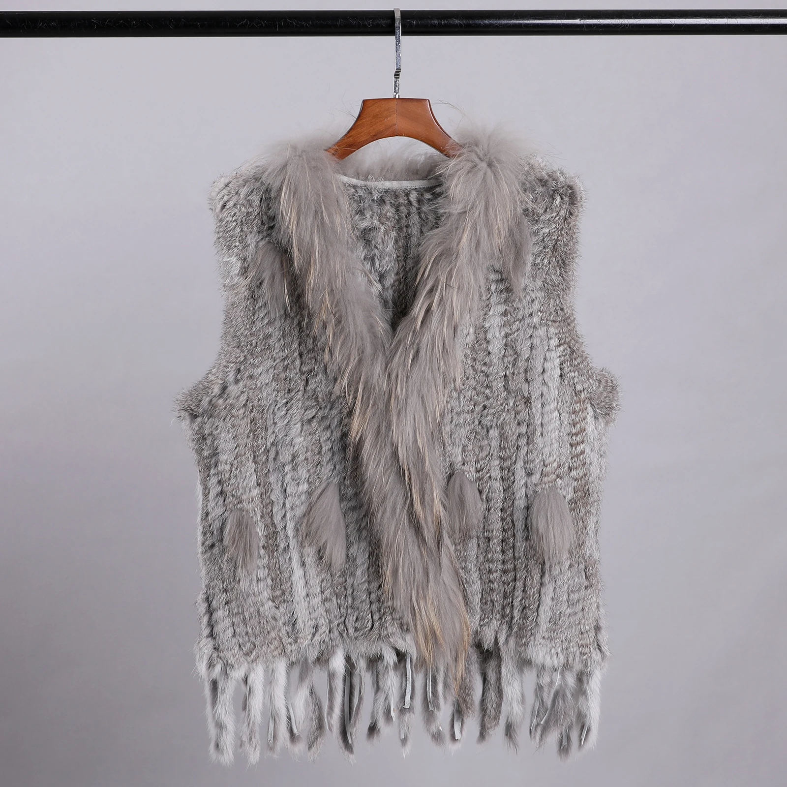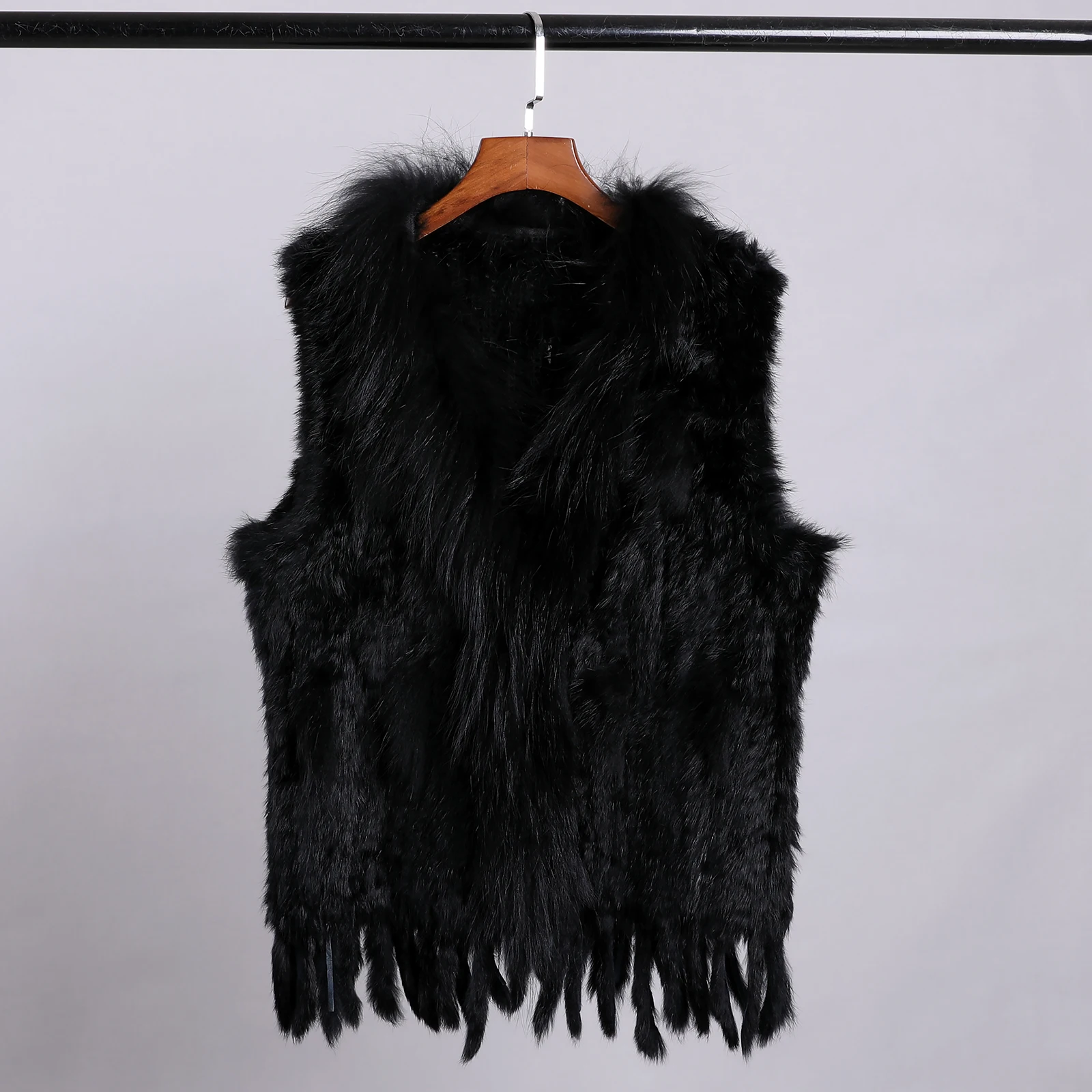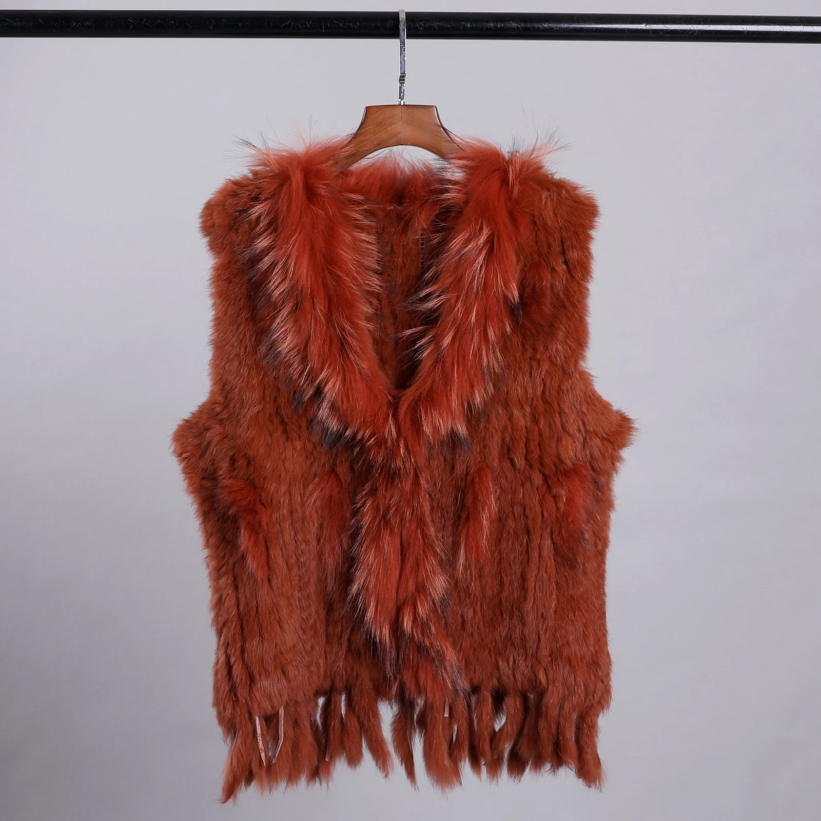 Color: Gold, Size: S - Luxury Women's Genuine Premium Long Hair Rabbit Fur Knit Vest Raccoon Fur Trim Gilet Lady Sleeveless Waistcoat Real Fur Jacket
