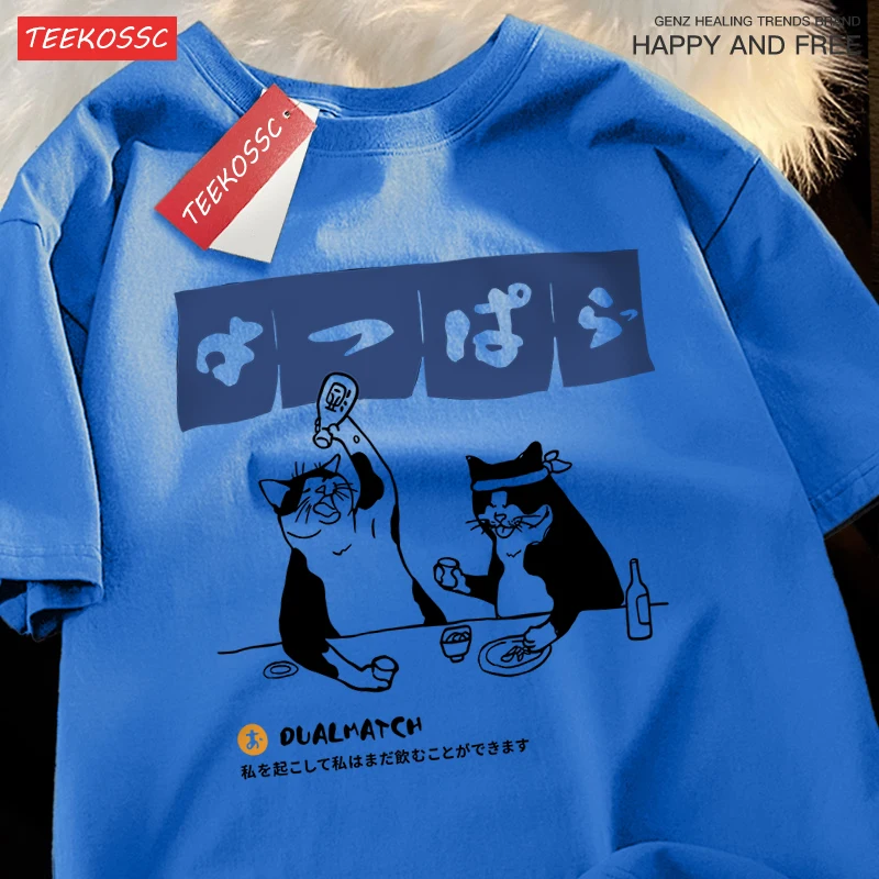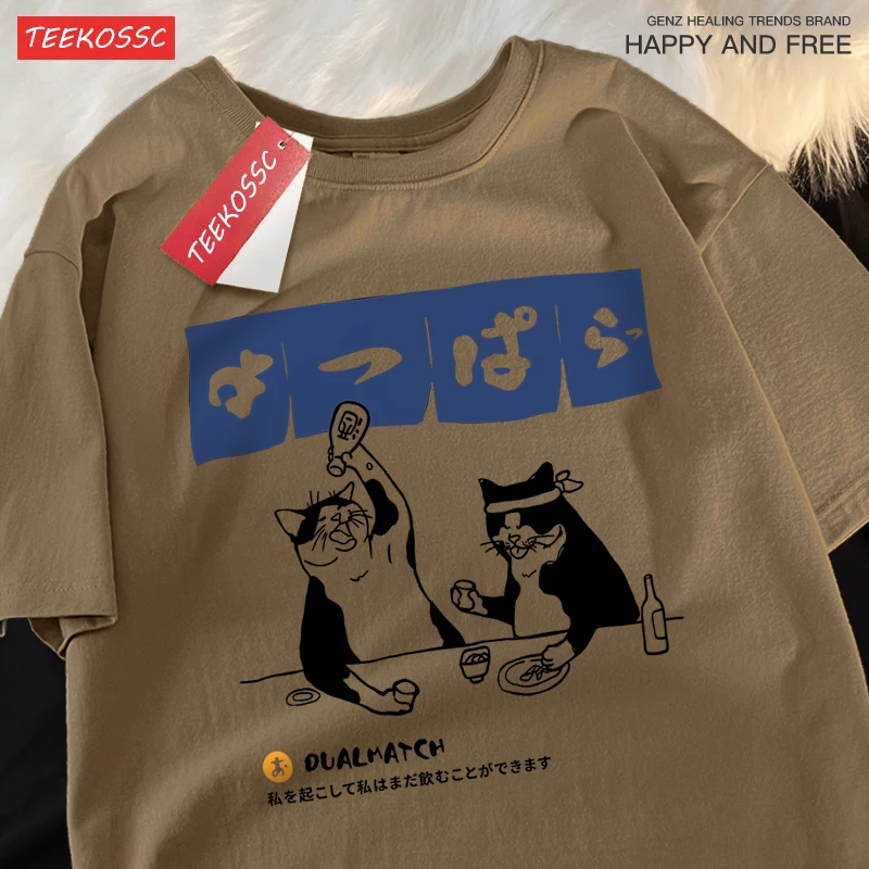 Color: Gold, Size: XXXL - Harajuku Japanese Cat Drinking Tops Mens Fashion O-Neck T-Shirt Street Summer Oversized Clothing Hip Hop Sweat Cotton Tshirts