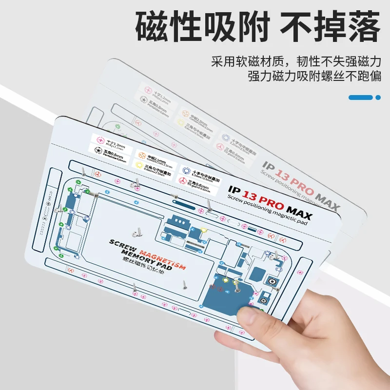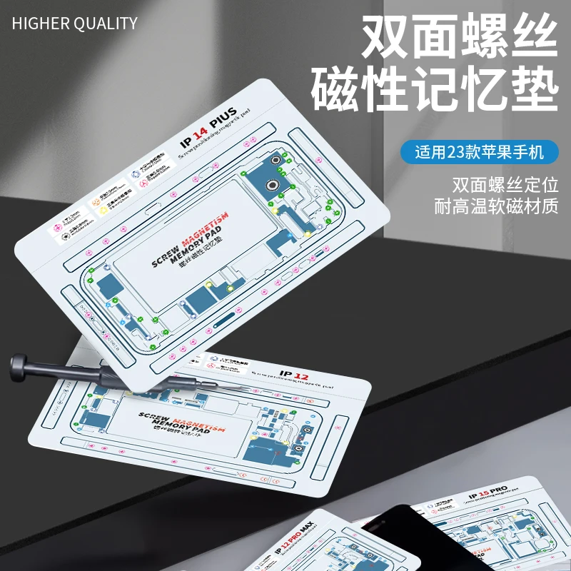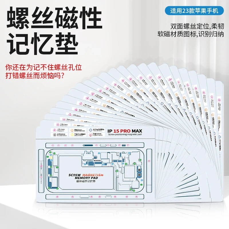 Double-sided screw magnetic positioning pad for iPhone X/XR/XS/XS Max/11/11Pro/12/12Mini/12Pro/12Pro Max/13/13Mini/13Pro/13Pro Max/14/14Plus/14Pro/14Pro Max/15/15Plus/15Pro/15Pro Max. Waterproof high temperature resistance soft screw keeper chart mat for mobile phone maintenance.