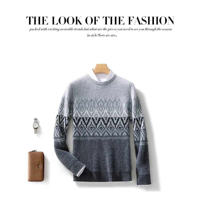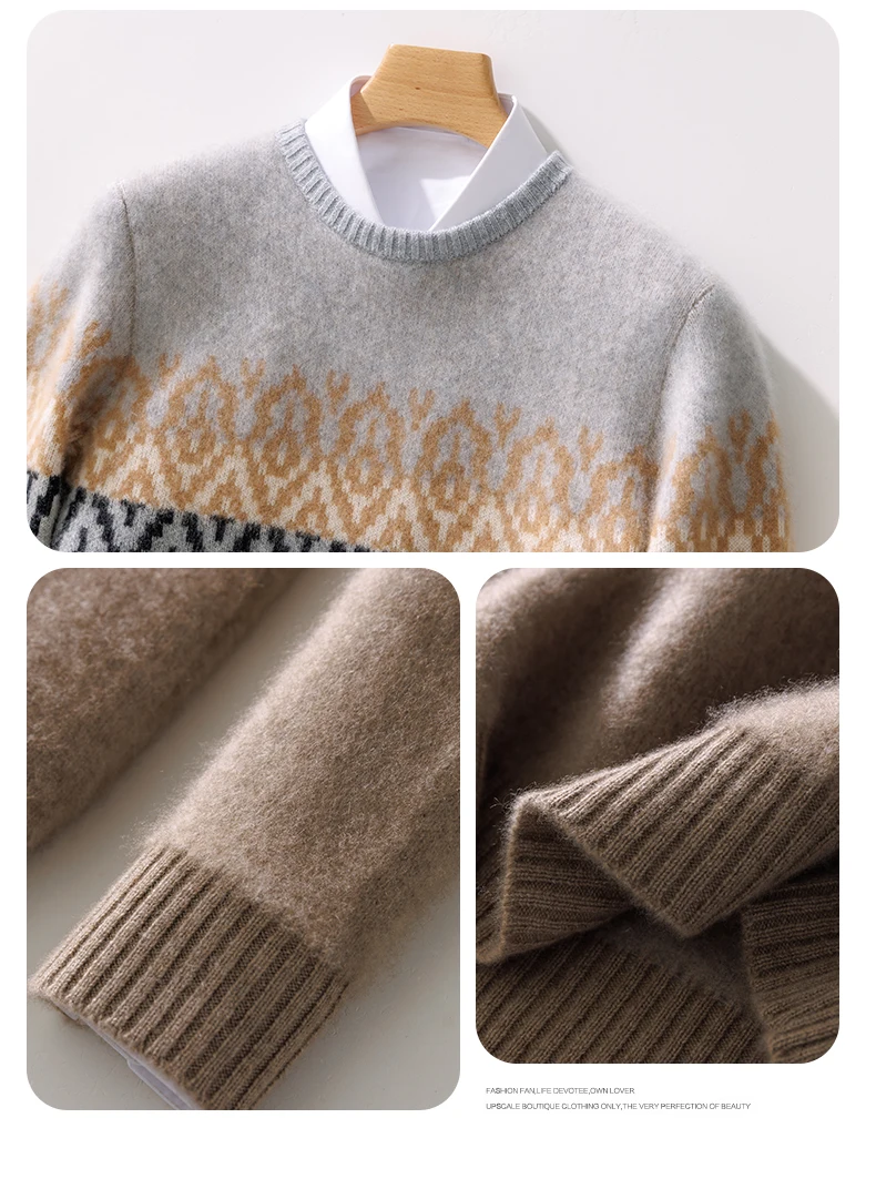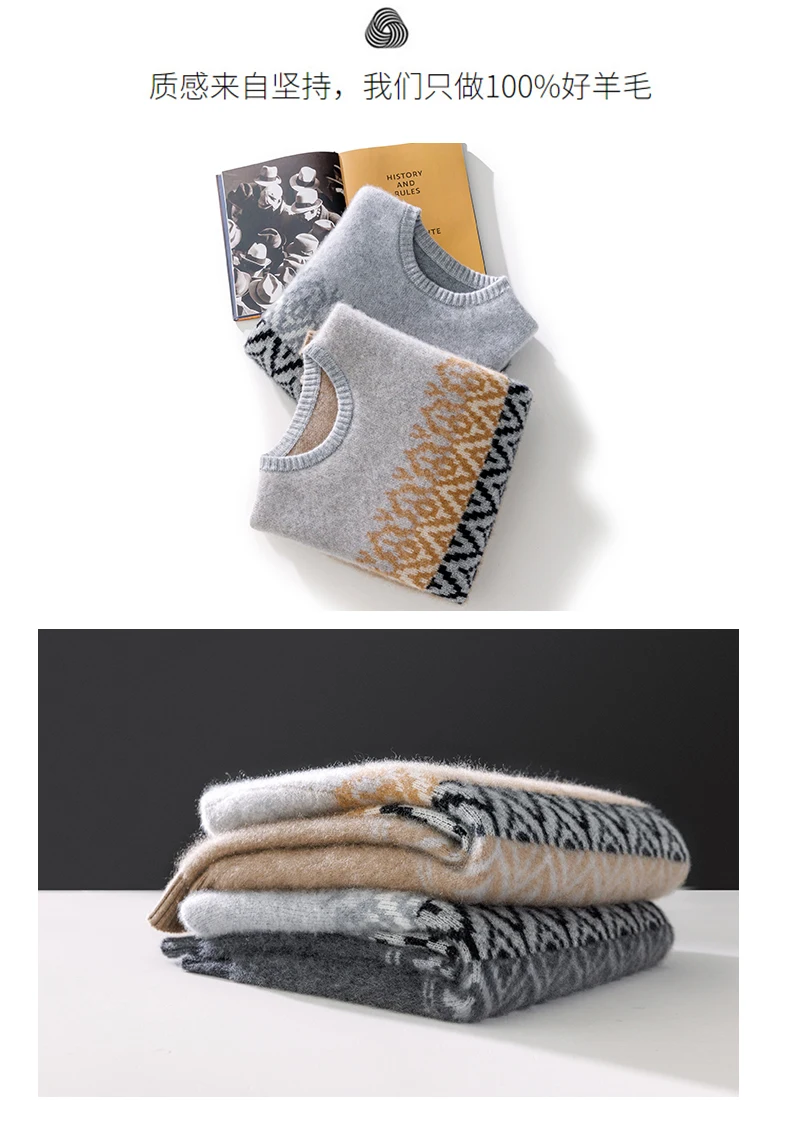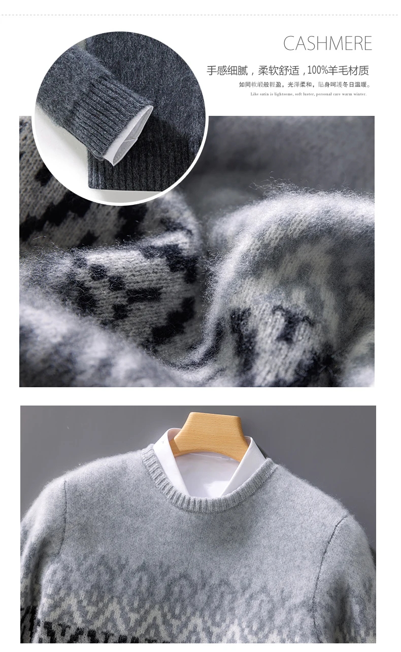 Color: GRAY, Size: XL - 100% Pure Wool Pullover Sweater Men's Round Neck Knitted Sweater Autumn Winter Thick Warm Ethnic Style Men's Clothing