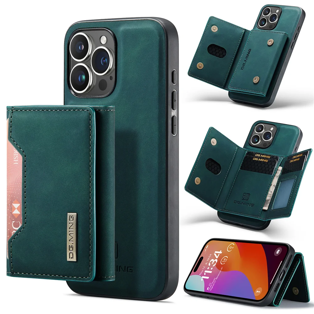 Color: green, Material: Genuine leather - 2 In 1 Case For iPhone 16 15 14 13 12 11 Pro Max Plus XS Max XR 8 Plus SE 2022 Wallet Magnetic Leather Card Holder Pocket Cover