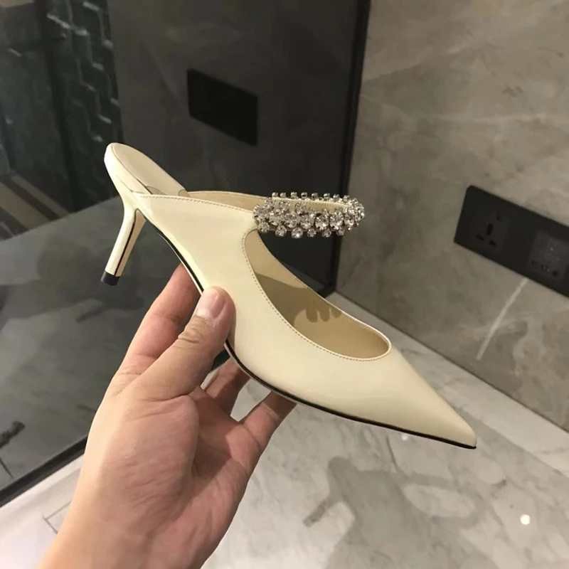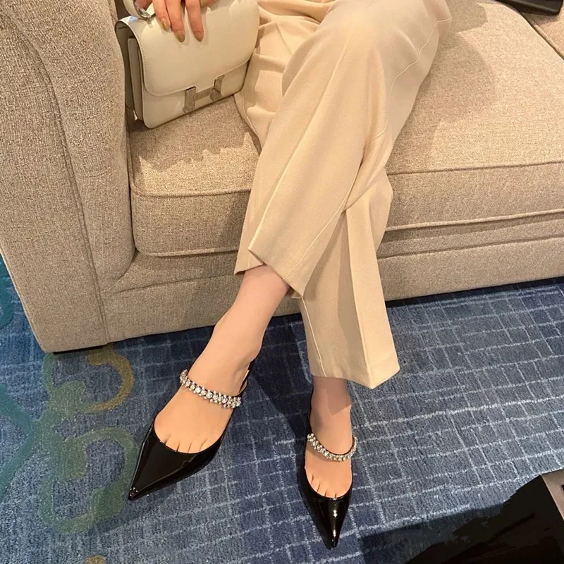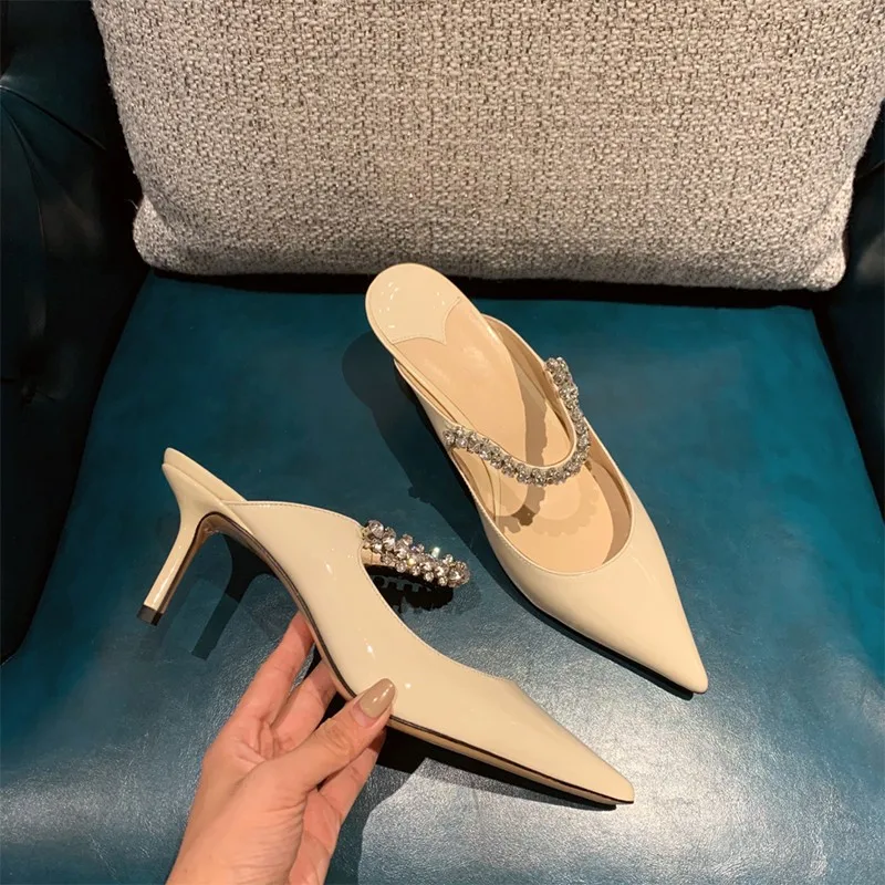 Color: green, Shoe Size: 41, Ships From: CHINA - Elegant Leather Mules Pointed Toe Stylish Rhinestone Embellished High Heel Sandals Sophisticated Party Evening Shoes Footwear