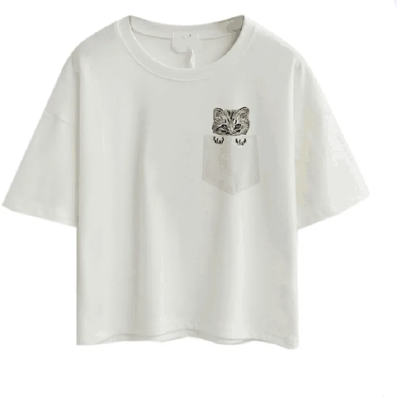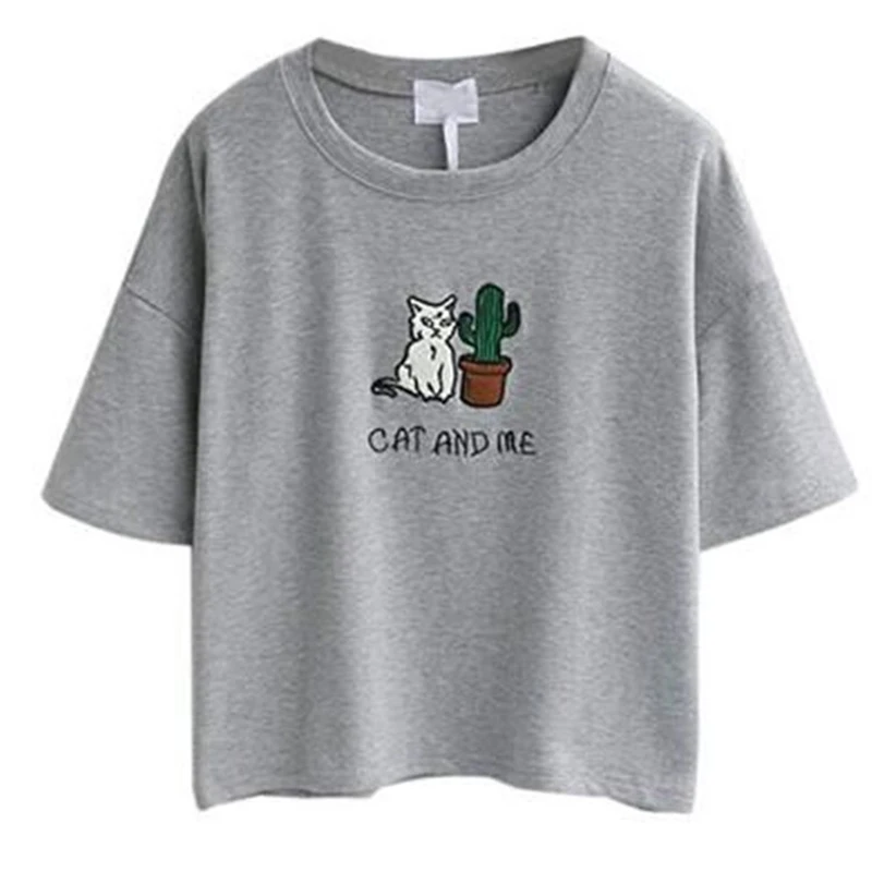 2019 Summer Cotton Short Sleeved Crop Top T-shirt Femme Embroidered Cat T shirts Cartoon Women Fashion Cactus Top Tee T Shirt