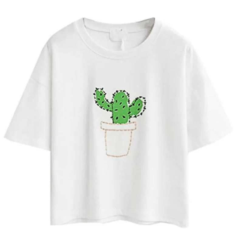 Color: green, Size: L, Ships From: CHINA - 2021 Summer Cotton Short Sleeved Crop Top T-shirt Femme Embroidered Cat T Shirts Cartoon Women Fashion Cactus Top Tee T Shirt