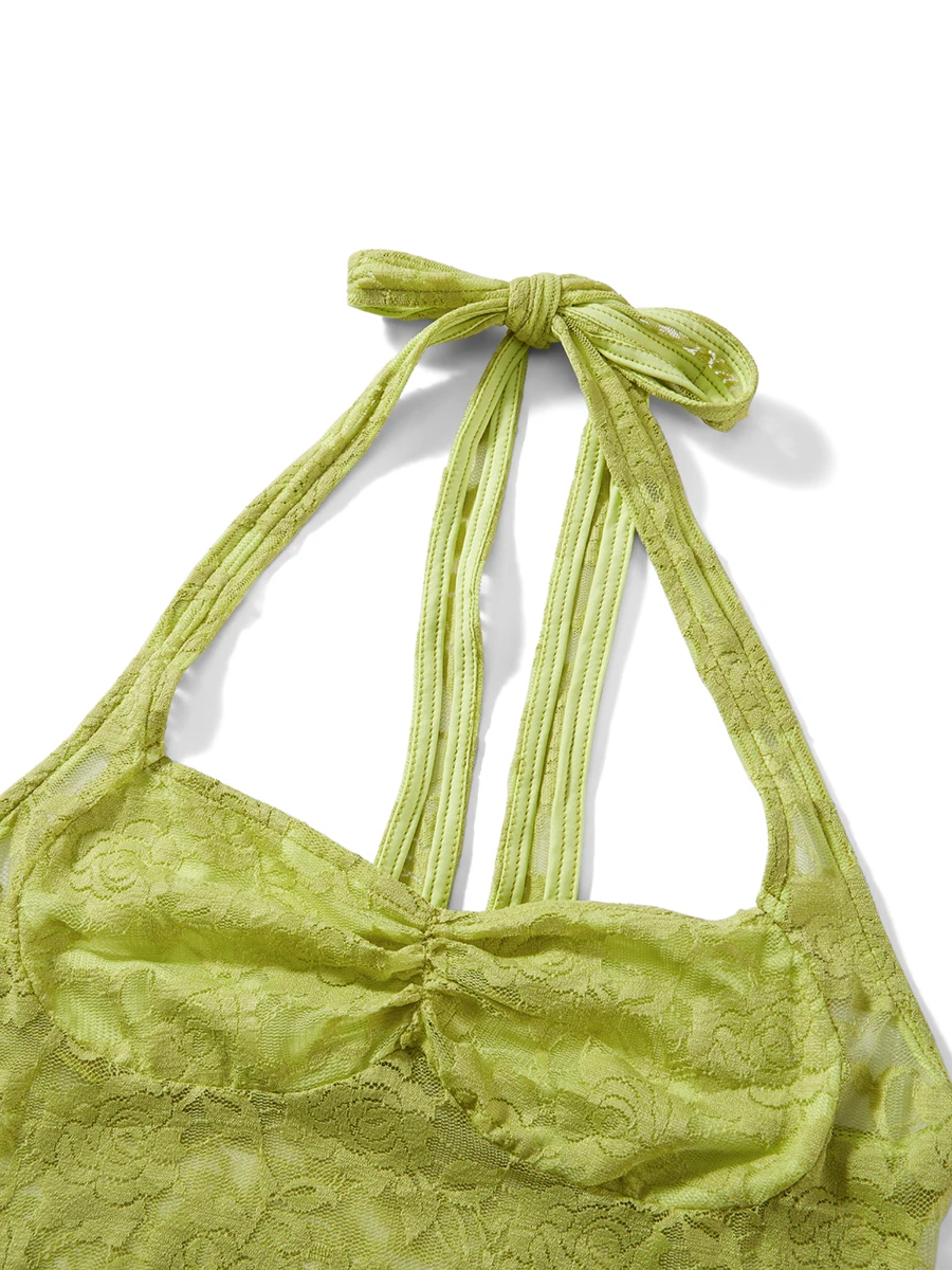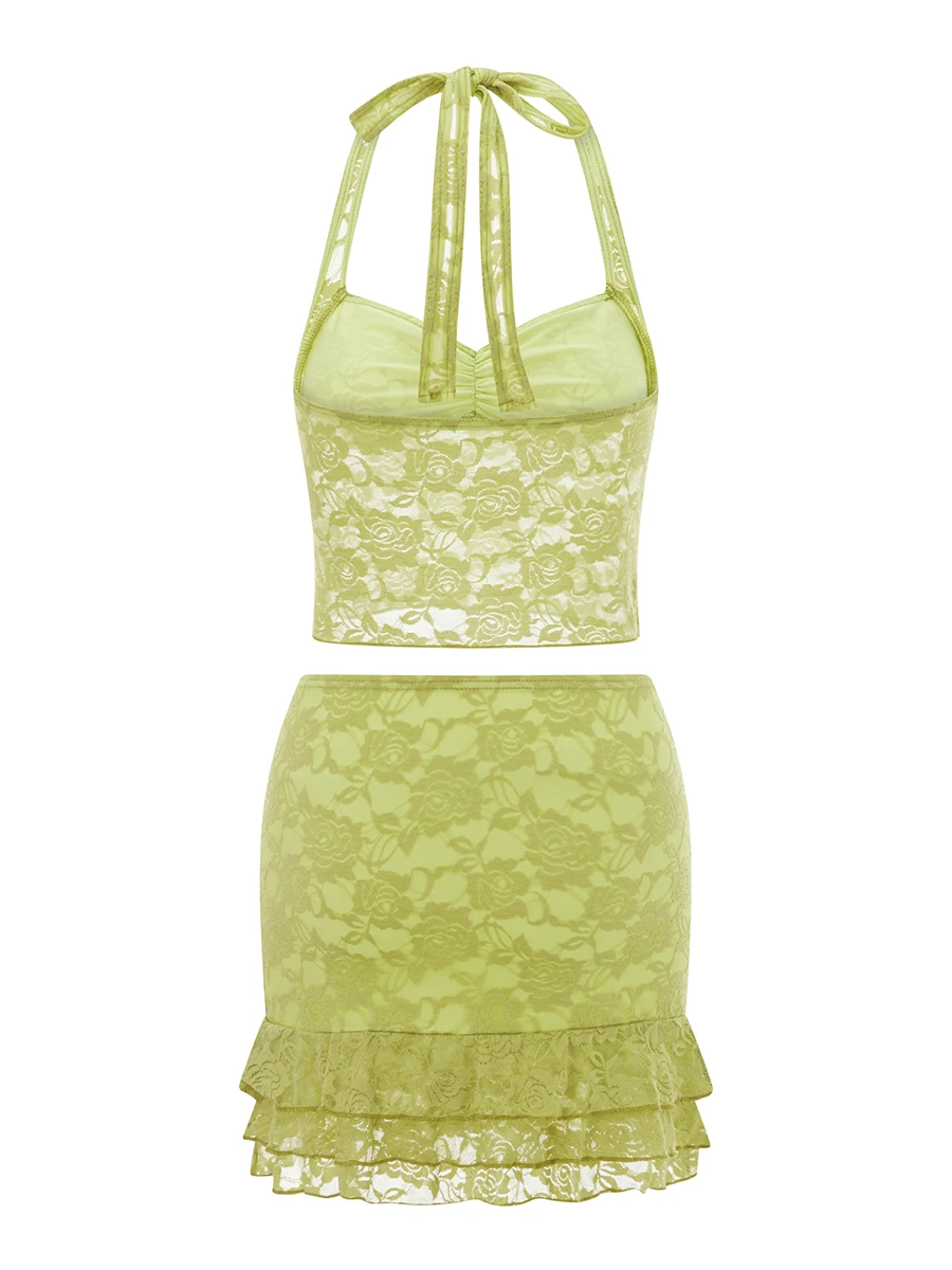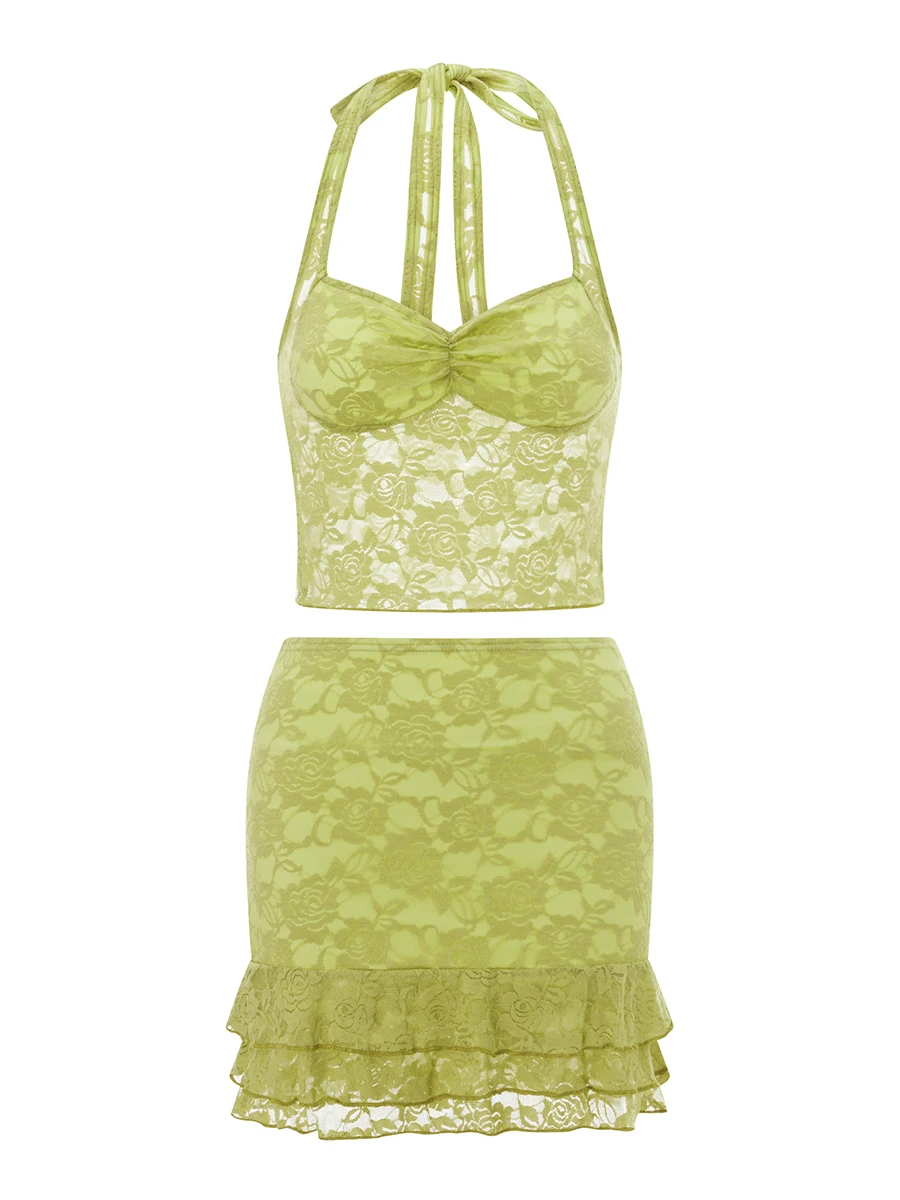 Color: Green, Size: XL - Women Summer Skirts Outfits Sexy Tie-Up Halter Neck Sleeveless Backless Lace Tank Tops Mini Skirts 2 Pieces Clothes Set Club