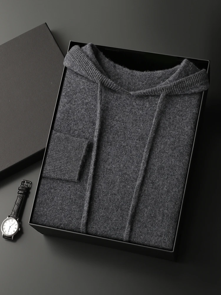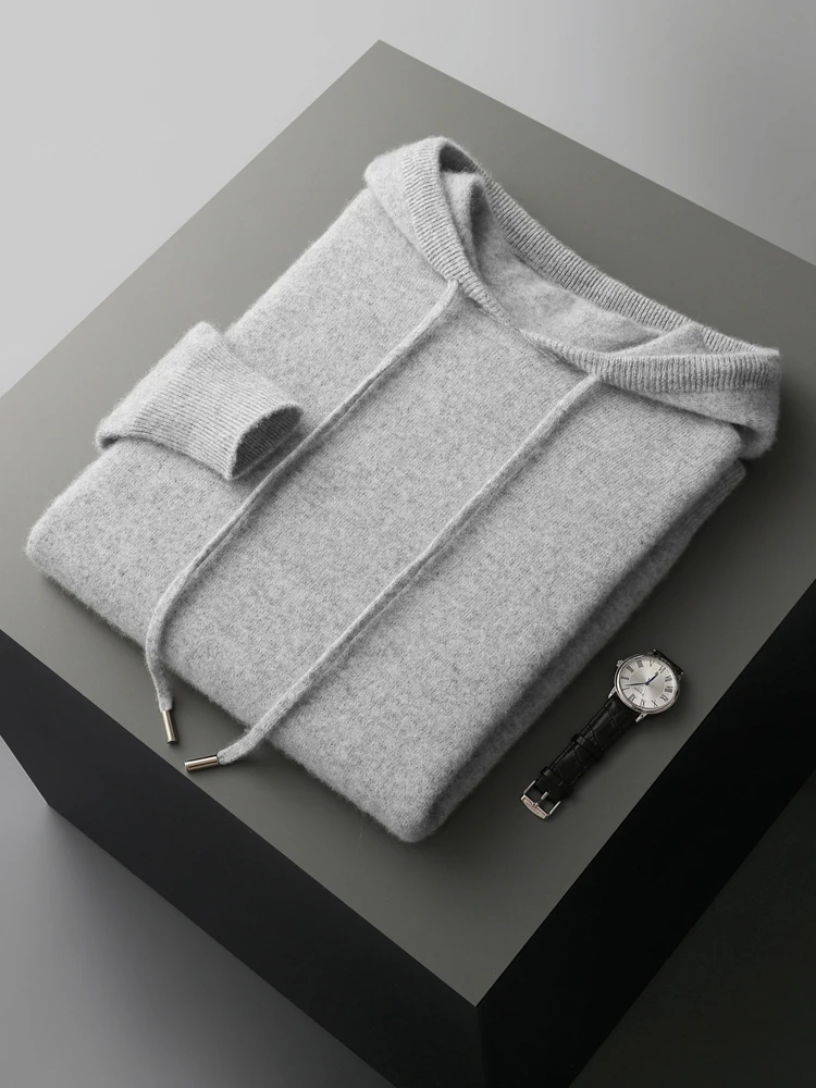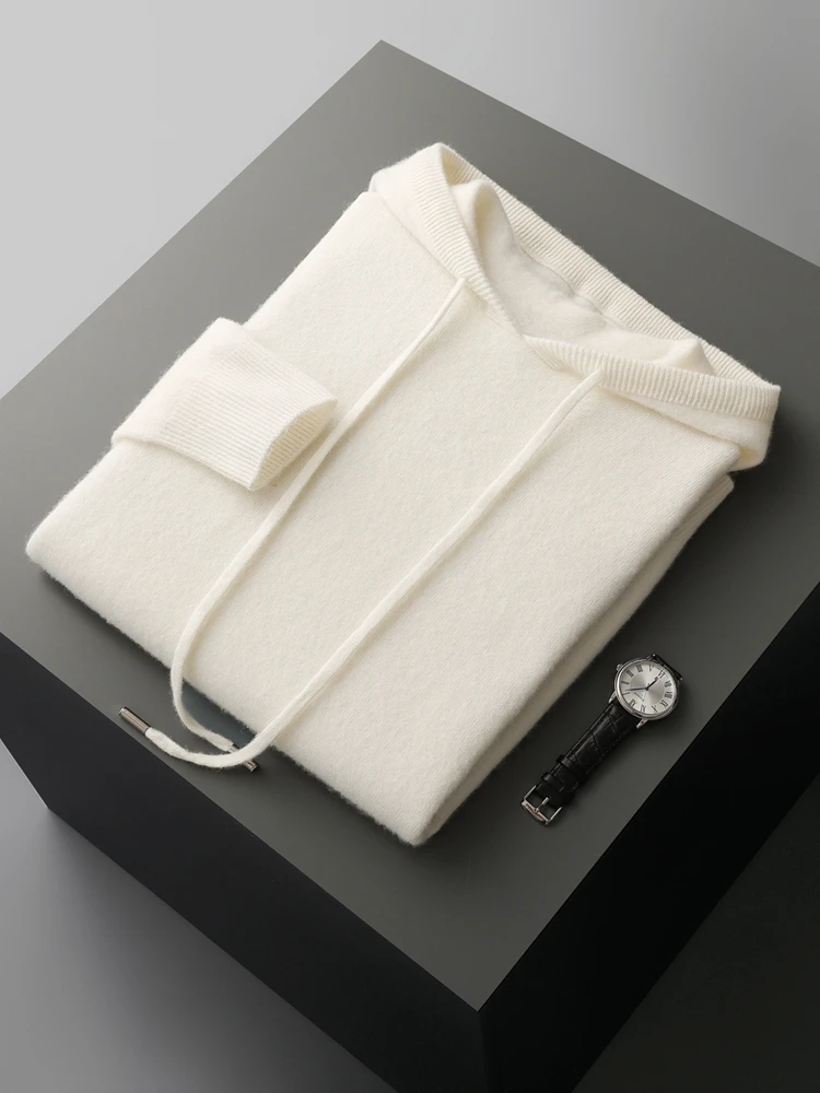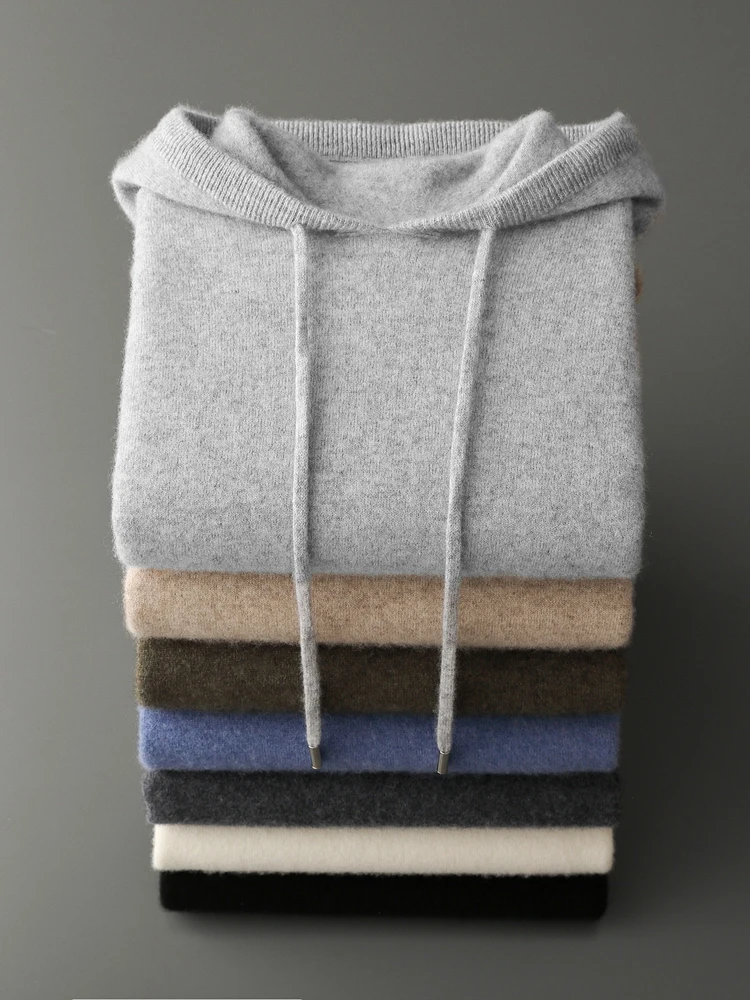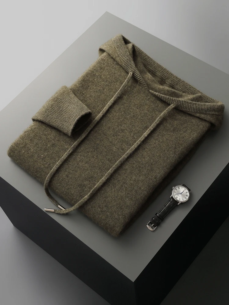 Color: green, Size: XXL - MEETCC Luxury Men Cashmere Hooded Pullover Thick Warm Hoodie Sweater Autumn Winter 100% Cashmere Knitwear Quality Jumpers Tops