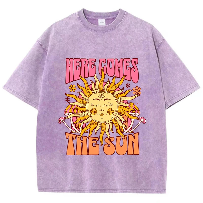 Color: green, Size: XXL - Oversize Women's Washed T-Shirt Cotton Here Comes The Sun Prints T Shirts Casual O-Neck Short Sleeve Tops Loose Women's Clothes