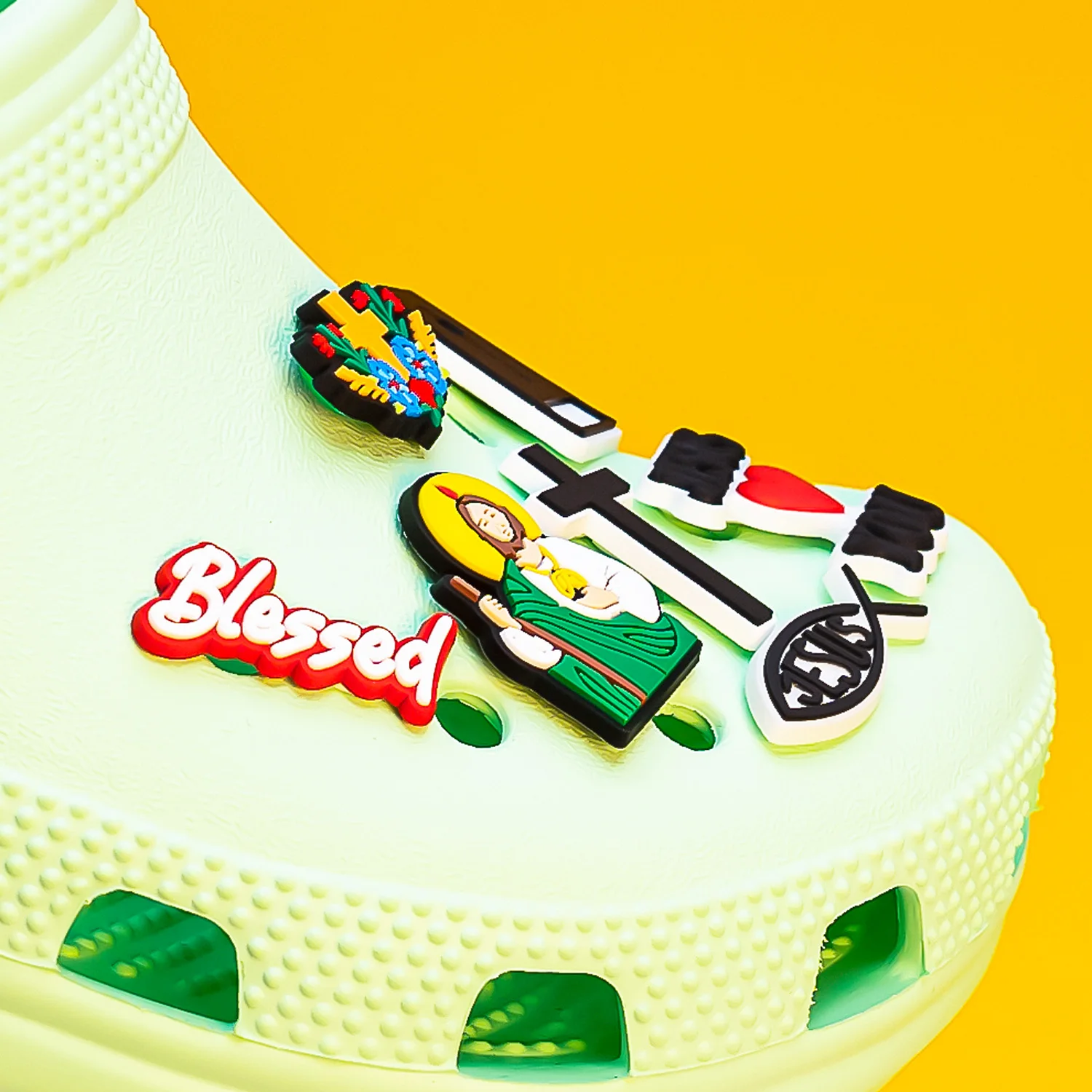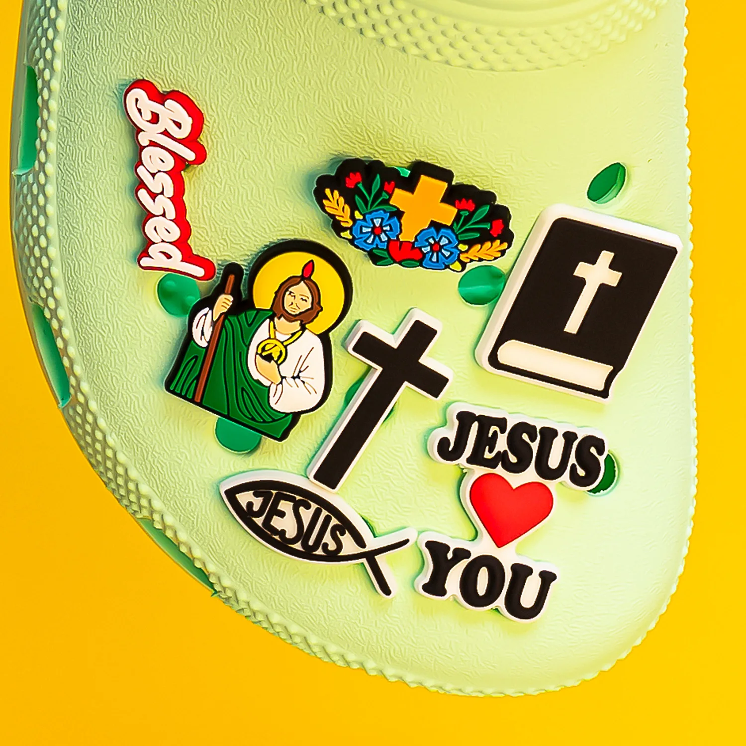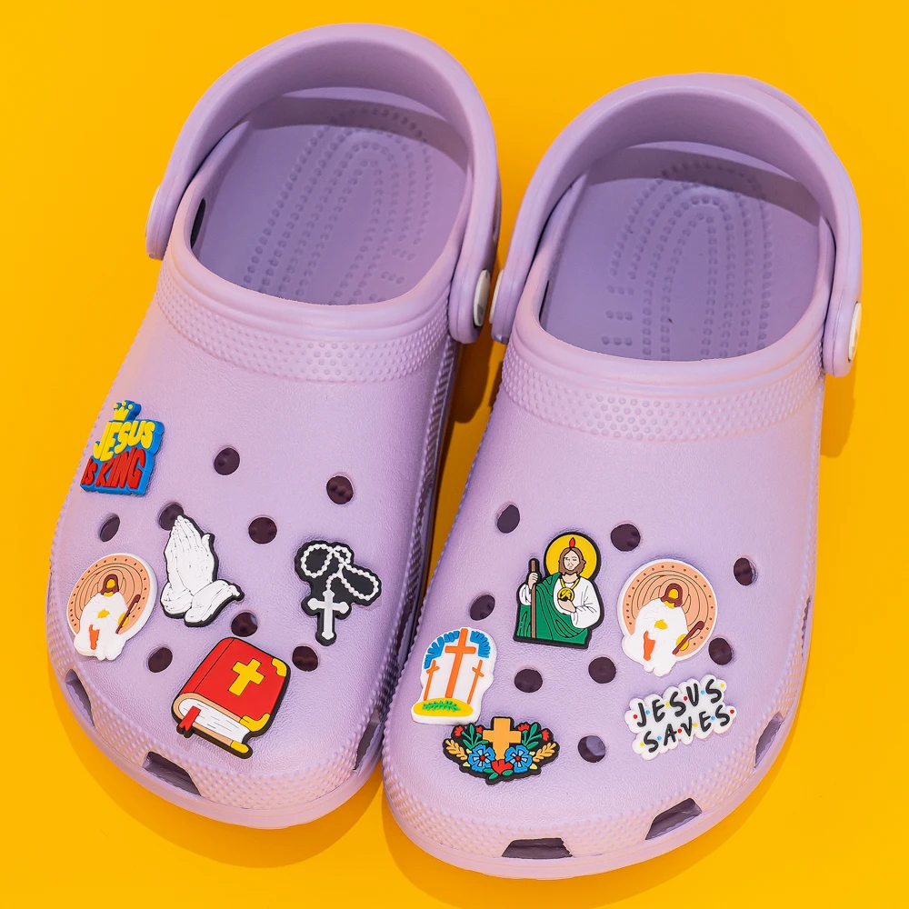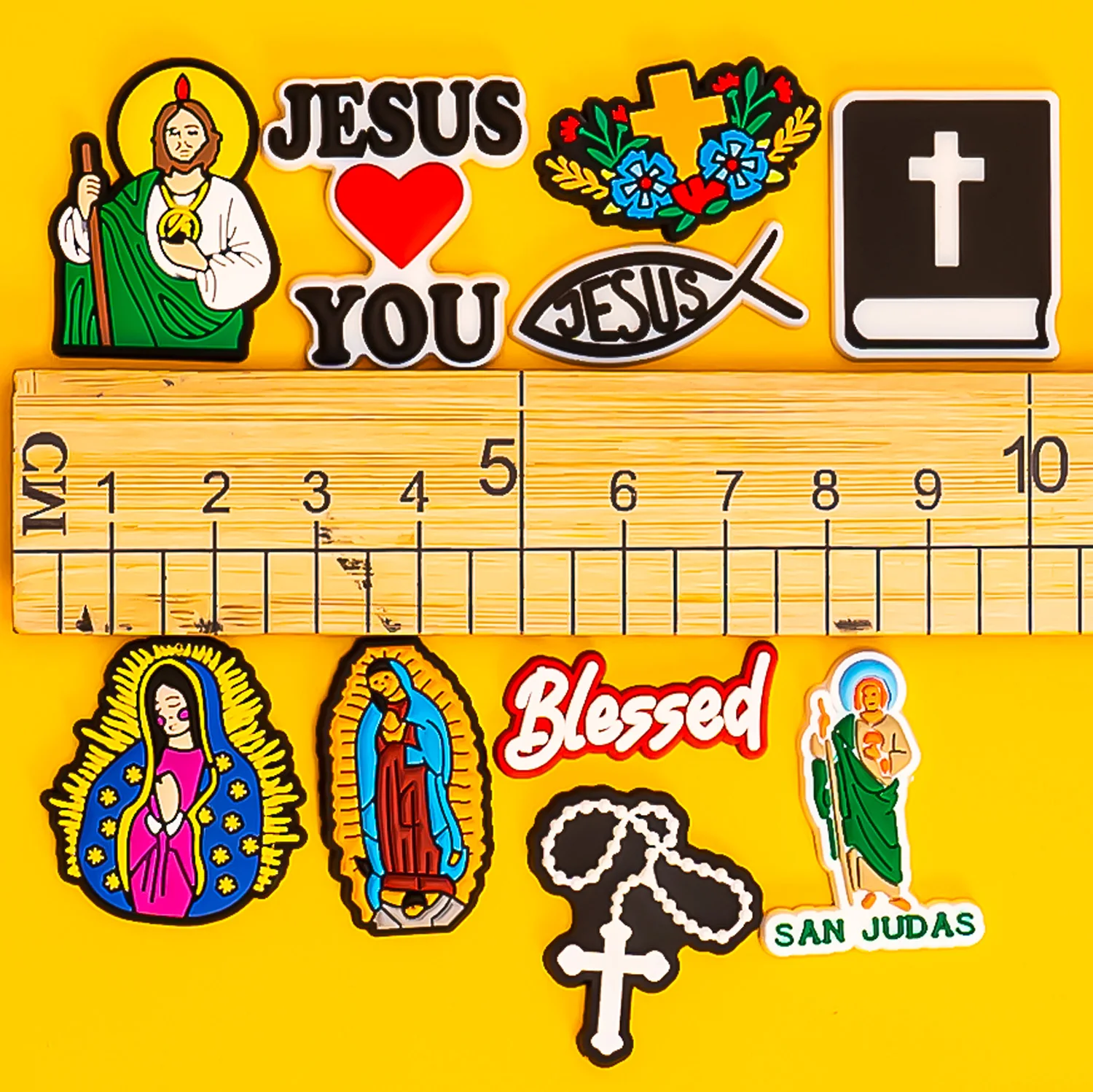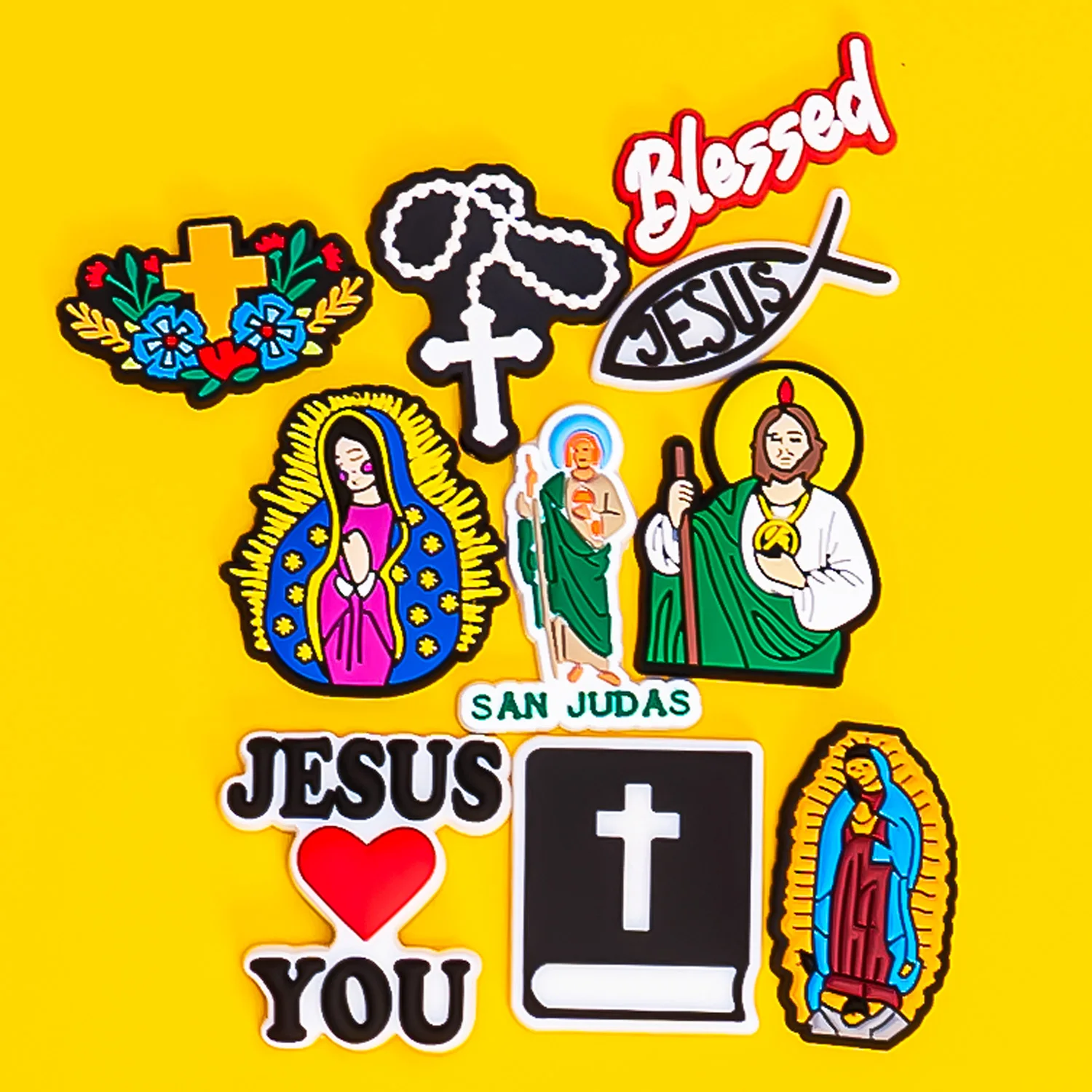 Color: light brown - 1pcs New Shoe Charm Religion PVC Clog Charms Crucifix Blessed Virgin Mary Clog Pin Clips Jeans Garden Sandal Shoe Decoration