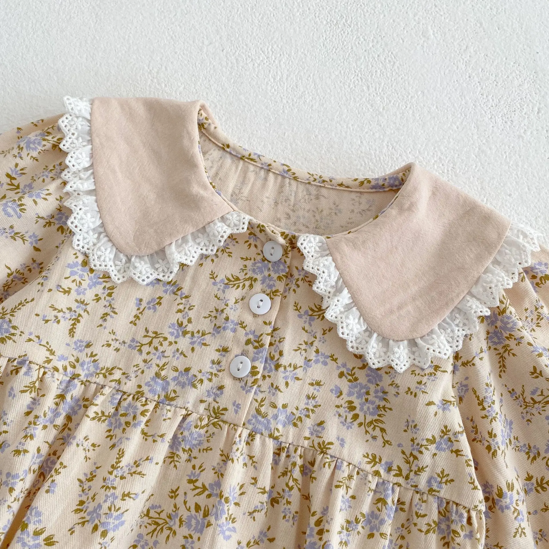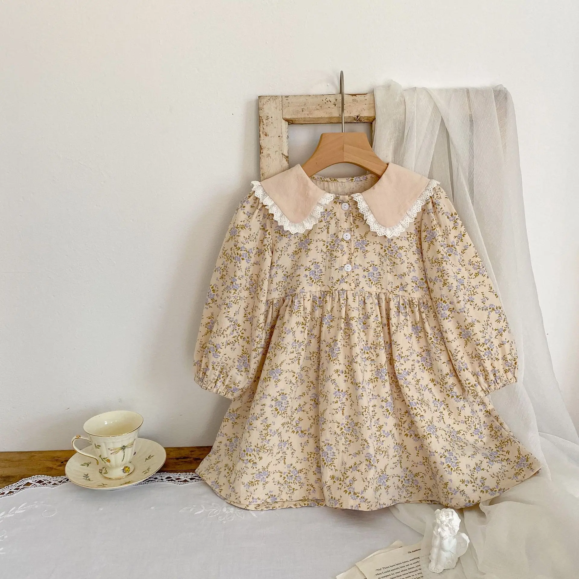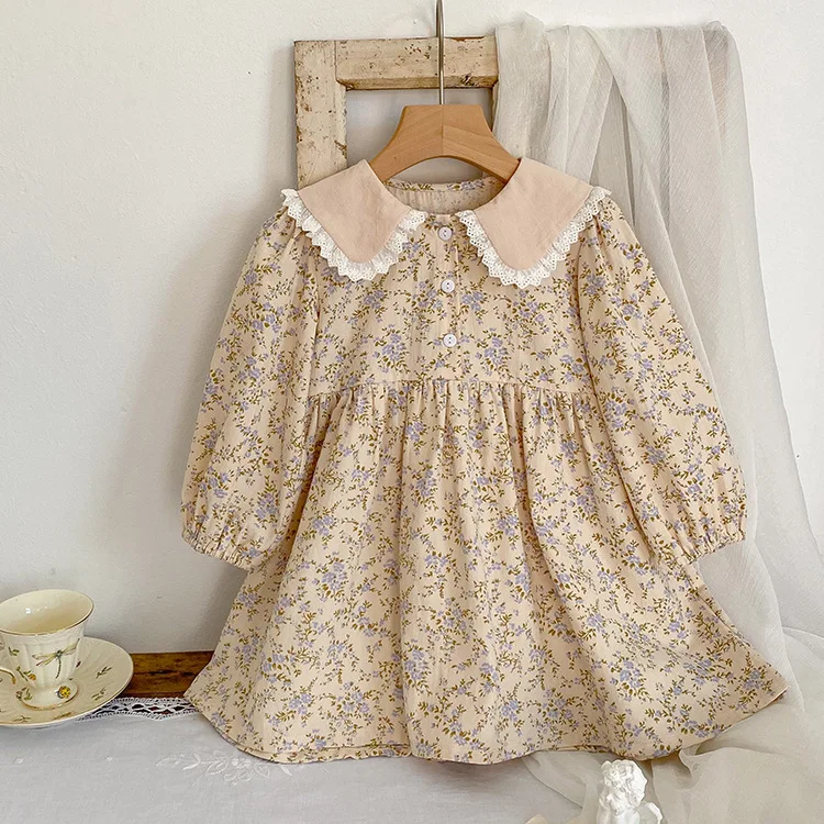 Color: light brown, Kid Size: 4 - Sweet Kids Baby Girls Long Sleeve Flower Printing Princess Dress Autumn Baby Girls Doll Collar Dress Children Clothes Dress