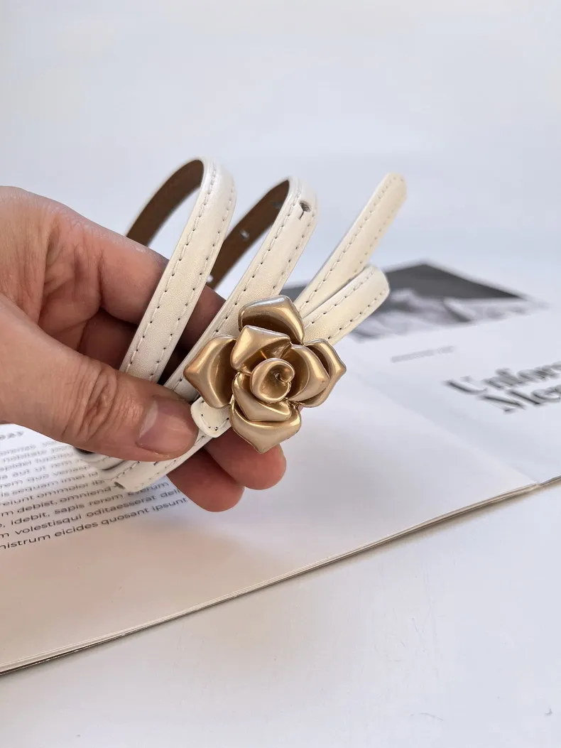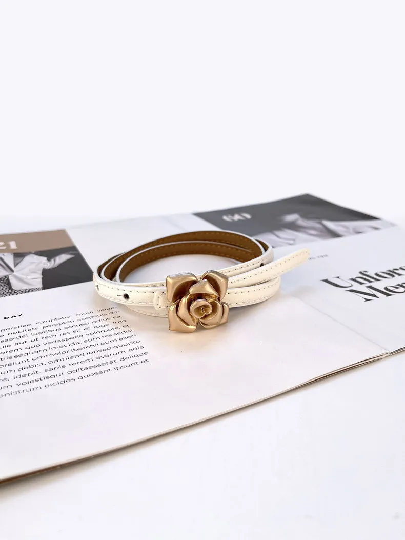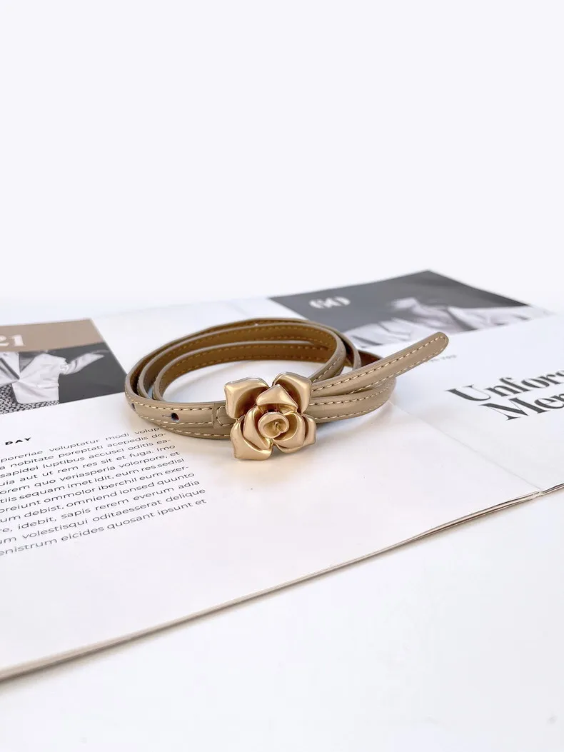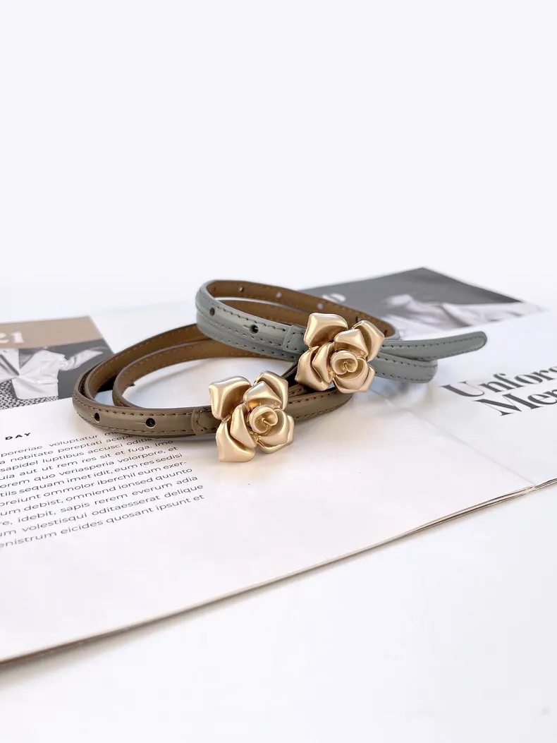 Color: LIGHT GRAY, Belt Length: 105CM - 1.0cm New Unique Rose Genuine Leather Gold Belt Women Fashion Cowskin Flower Thin Belts Female Jeans Dress Waistband