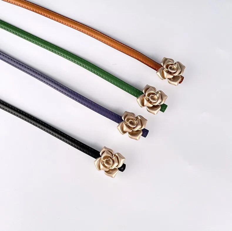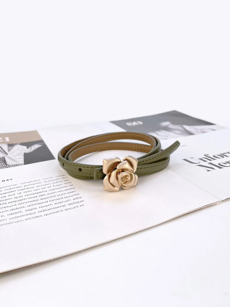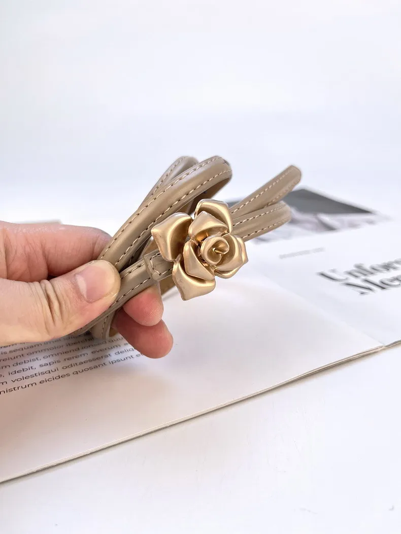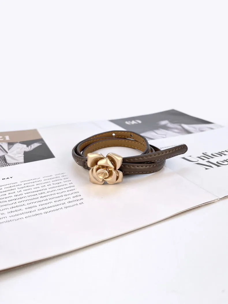 Color: LIGHT GRAY, Belt Length: 105CM - 1.0cm New Unique Rose Genuine Leather Gold Belt Women Fashion Cowskin Flower Thin Belts Female Jeans Dress Waistband