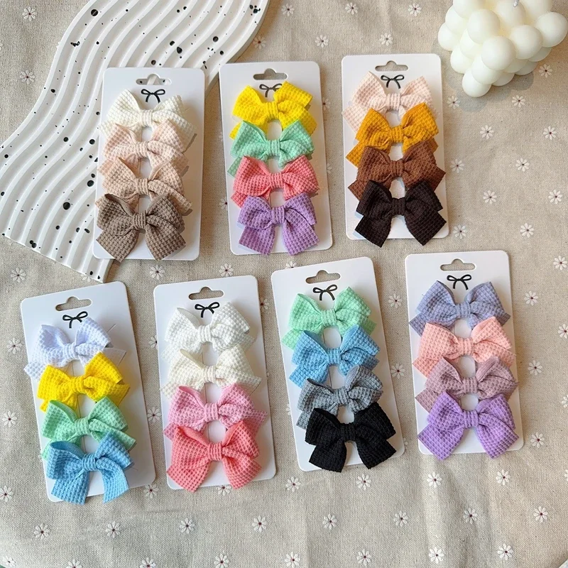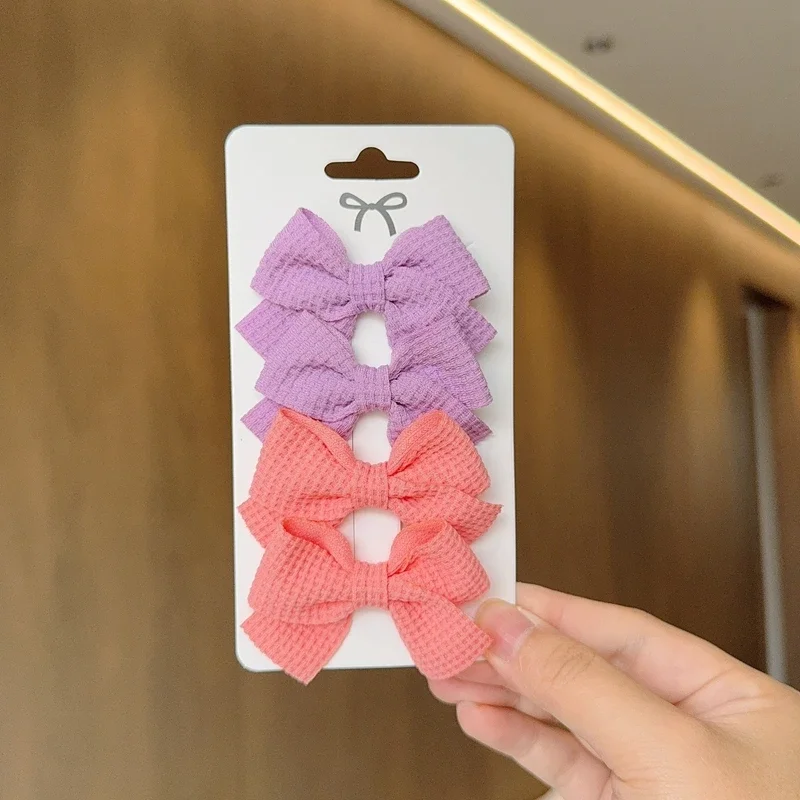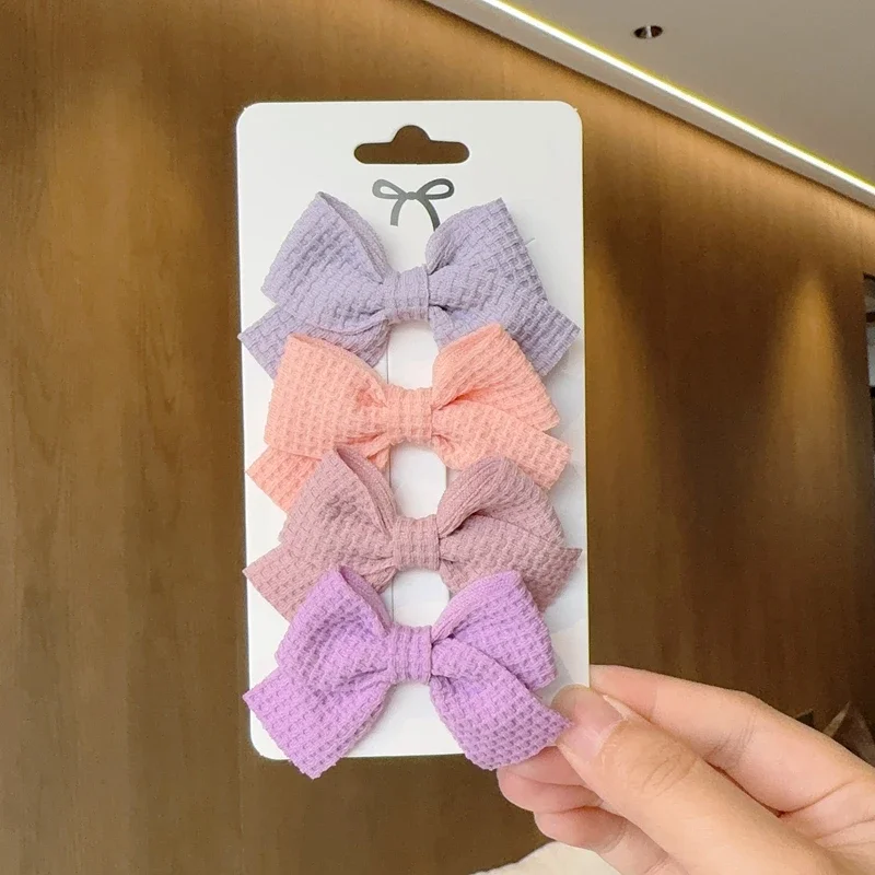 Color: MAROON - 4PCS Soft Cotton Bow Hairpin Girl Sweet Plaid Design Hairpin Color Block Delicate Hairgripe Barrettes Kawaii Child Accessories