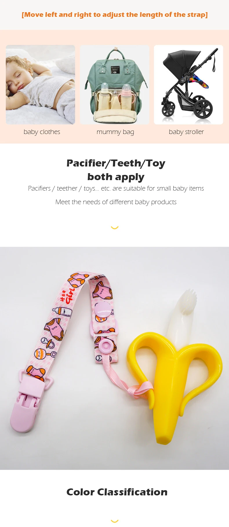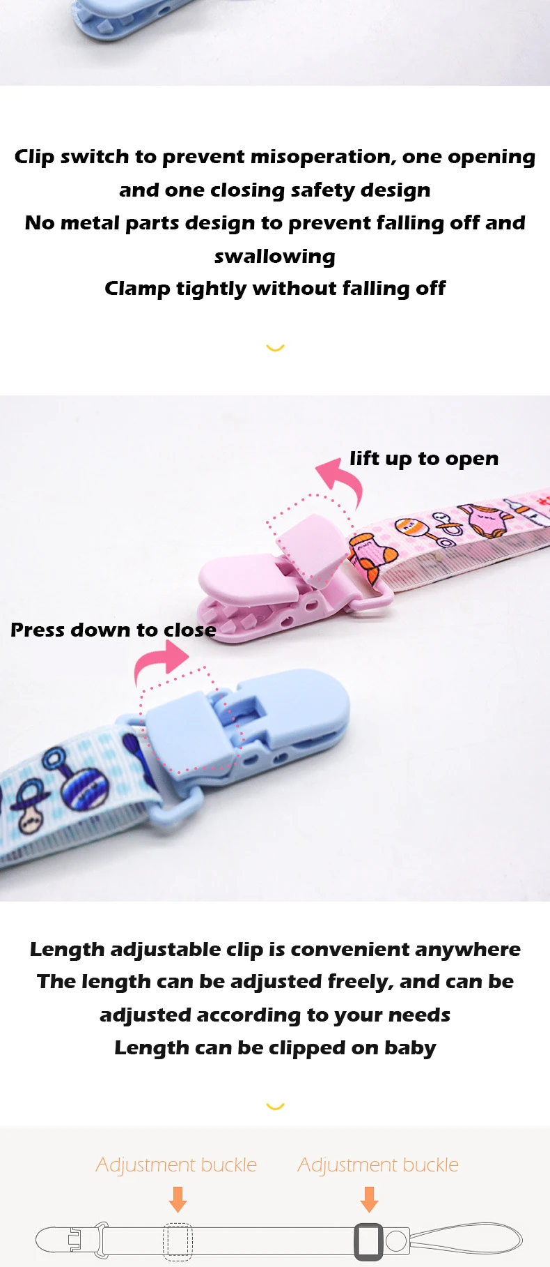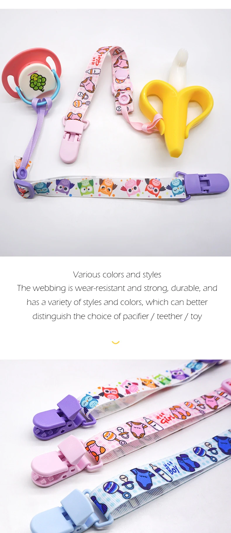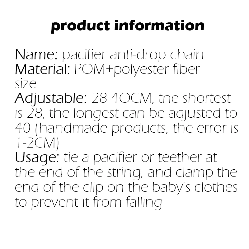 【How to use】The clip is clipped on the baby's clothes, and the other end is tied to a pacifier, teether, small toys, etc.