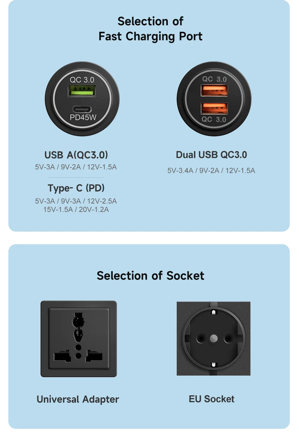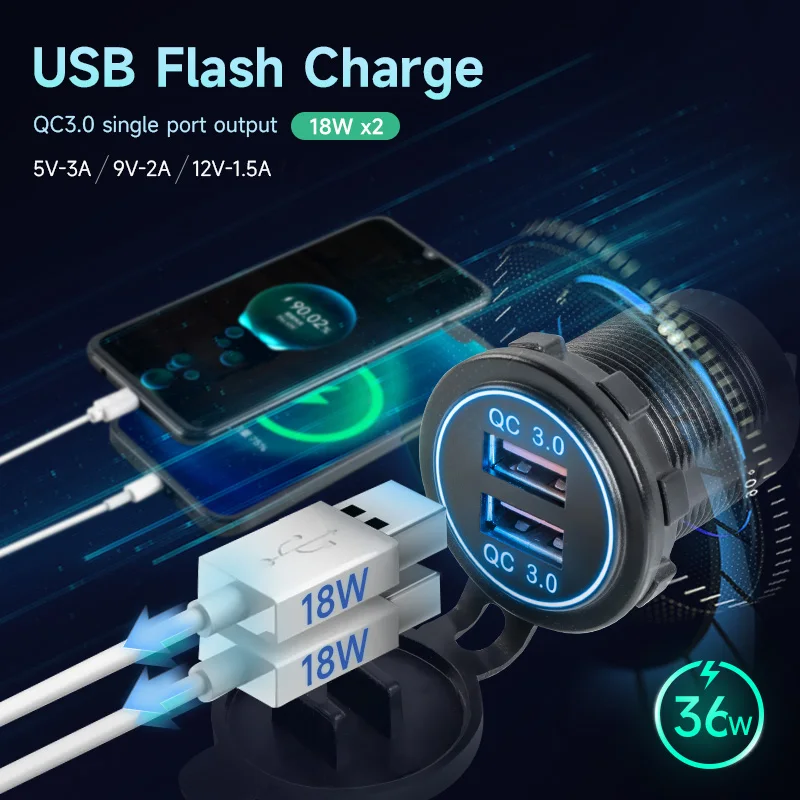 Dual QC3.0 quick charging port,The fastest speed of single port canreach 3.4A.Can provide full speed charging for both devices at thesame time