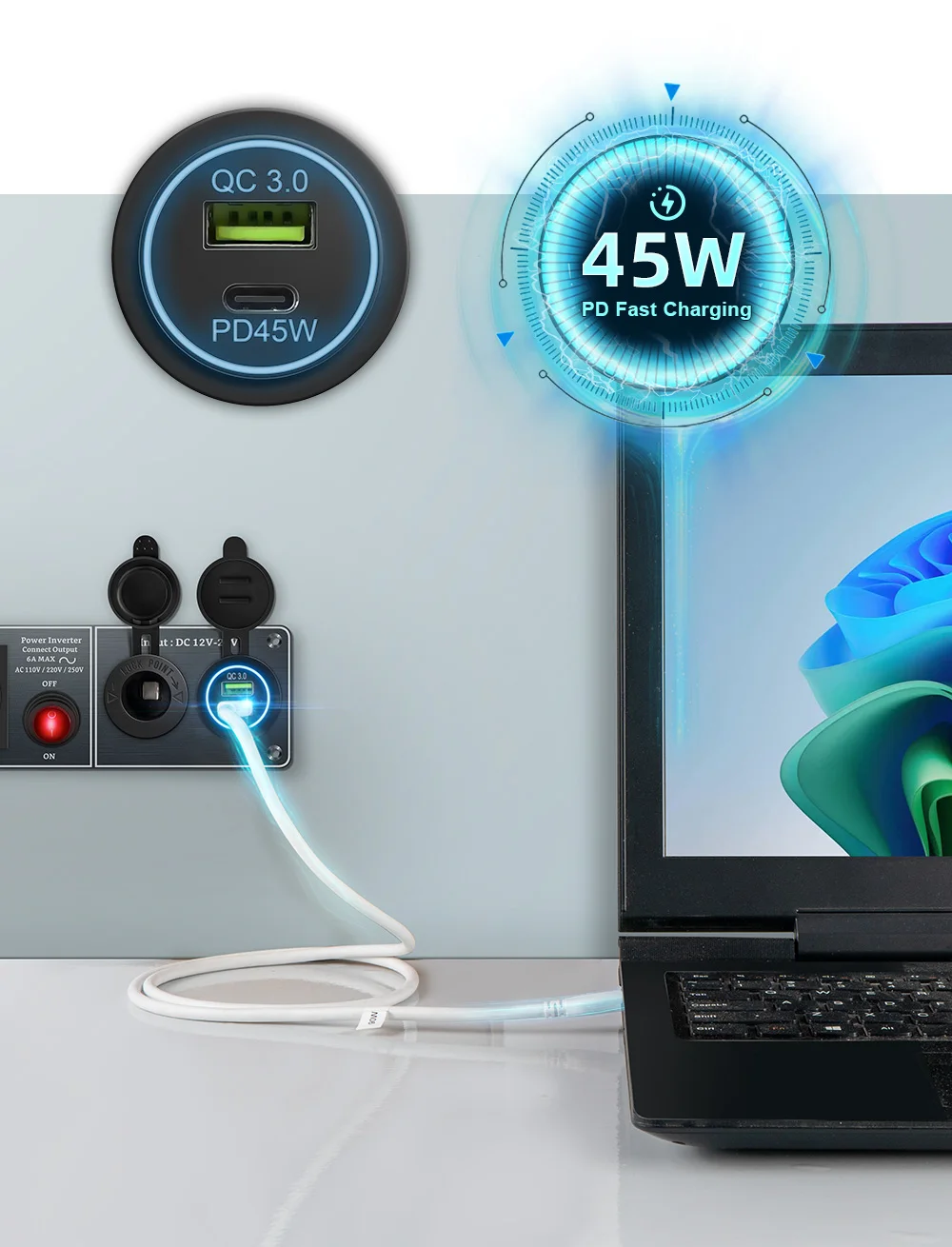 Color Name: GRAY, Ships From: CHINA - Car Charger Multi-Functions Aluminum Panel Inverter AC110V 220V Dual Port USB QC3.0 12V 24V for RV Yacht Travel Trailers