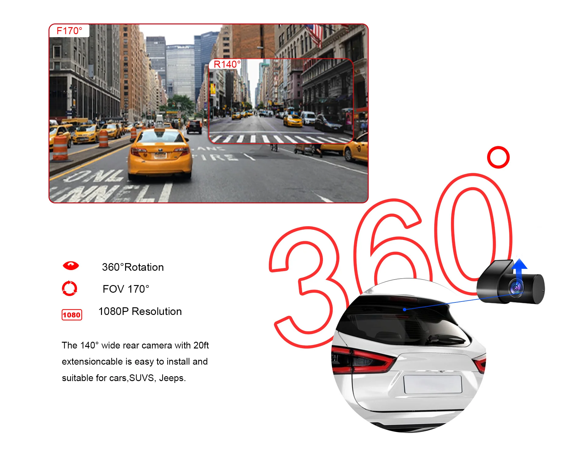 1080P 360° Rotation Rear Camera,(For 2K Dual Cam Version) / (For 4K Dual Cam Version)(Suitable for installation in the car for shooting, not suitable for installation outside the car for shooting, not waterproof)