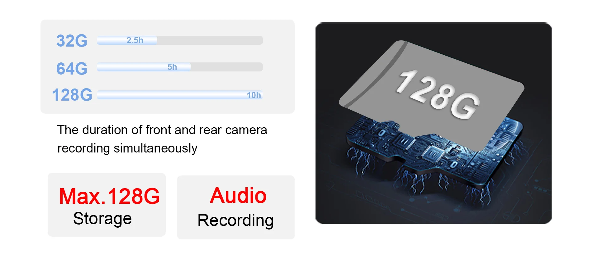 The front and rear cameras simultaneously capture the road front and rear in crystal details, provid-ing different perspectives and all-round protection for you. Front camera records a crystal clear HDvideo in 2160P/1600P/1080P resolution as what you need.