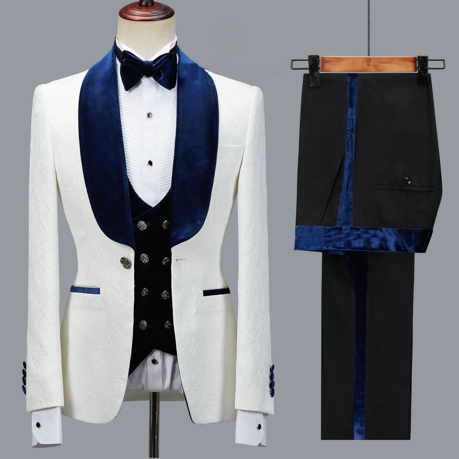 Color: Navy Blue, Size: M - Floral Jacket Men Suit Slim Fit Wedding Tuxedo Navy Blue Velvet Lapel Groom Party Suits Costume Homme Best Man Blazer