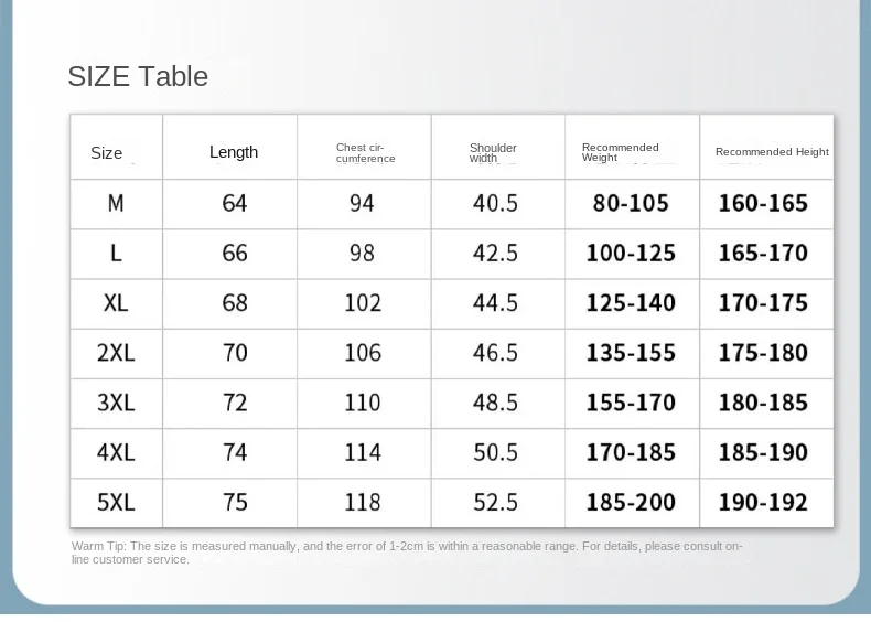 size_info: {"sizeInfoList":[{"length":{"cm":"42.5","inch":"16.73"},"size":"M","vid":-1},{"length":{"cm":"44.5","inch":"17.52"},"size":"L","vid":-2},{"length":{"cm":"46.5","inch":"18.31"},"size":"XL","vid":-3},{"length":{"cm":"48.5","inch":"19.09"},"size":"XXL","vid":-4},{"length":{"cm":"50.5","inch":"19.88"},"size":"XXXL","vid":-5},{"length":{"cm":"52.5","inch":"20.67"},"size":"4XL","vid":-6},{"length":{"cm":"54.5","inch":"21.46"},"size":"5XL","vid":-7}]}