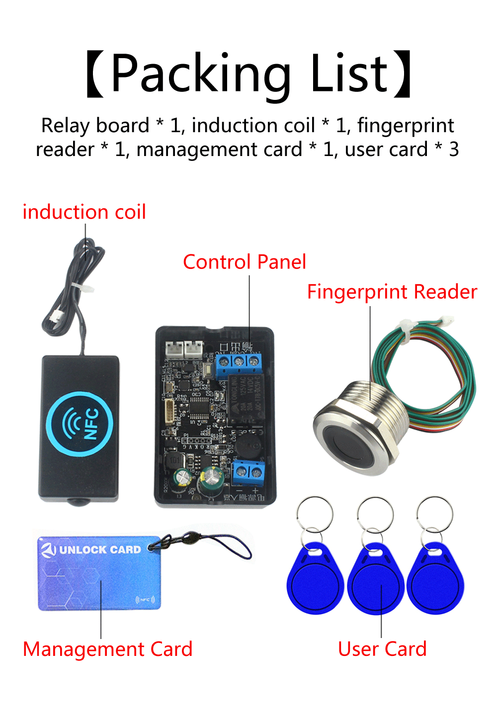 Control board + shell x1, induction antenna x1, management card x1, user card x3