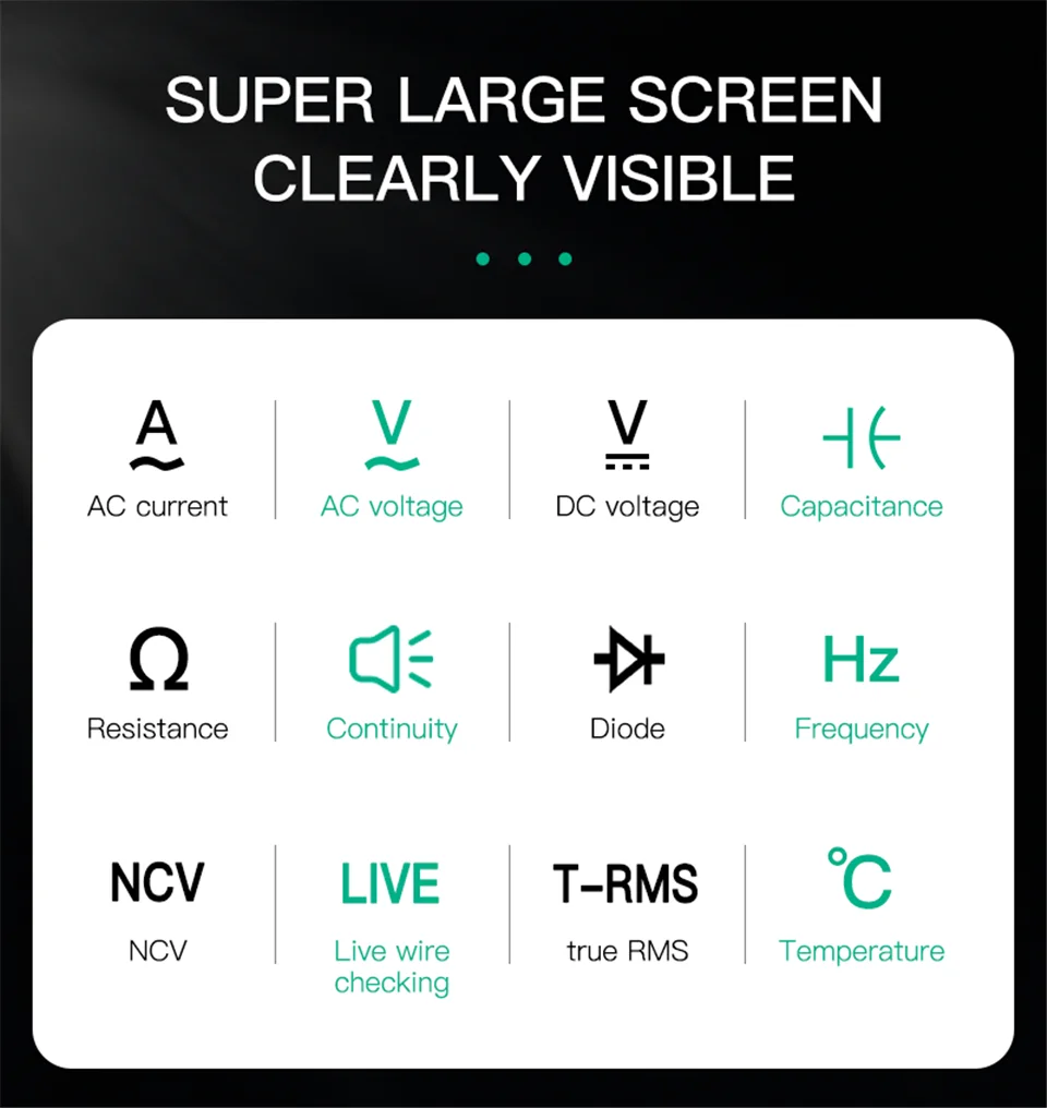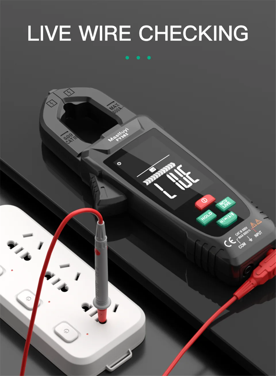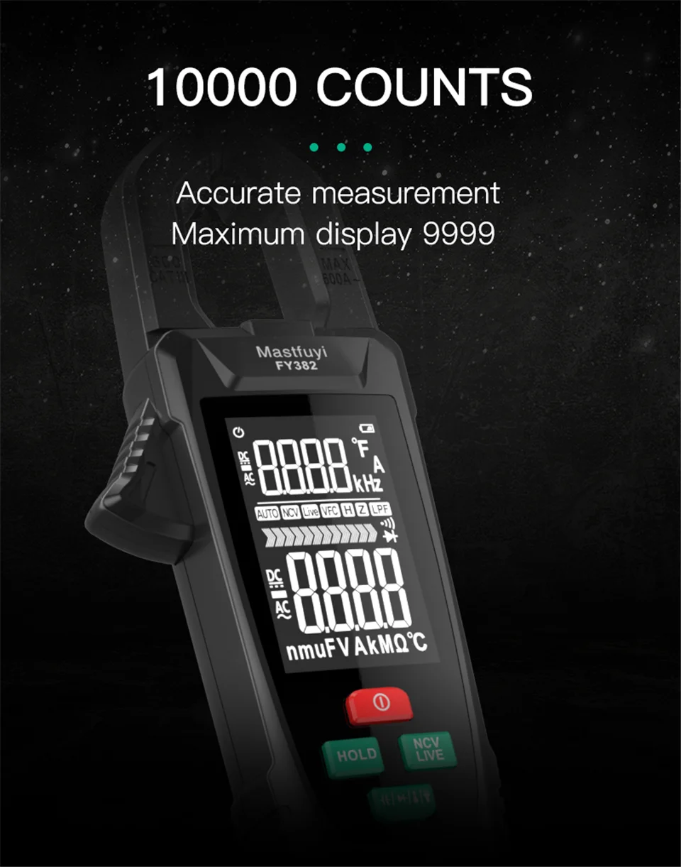 ●True RMS digital clamp meter with 9999 counts, wide measuring range and high accuracy. It can test AC current, AC voltage, DC voltage, temperature, capacitance, resistance, continuity, diode, frequency and live wire.