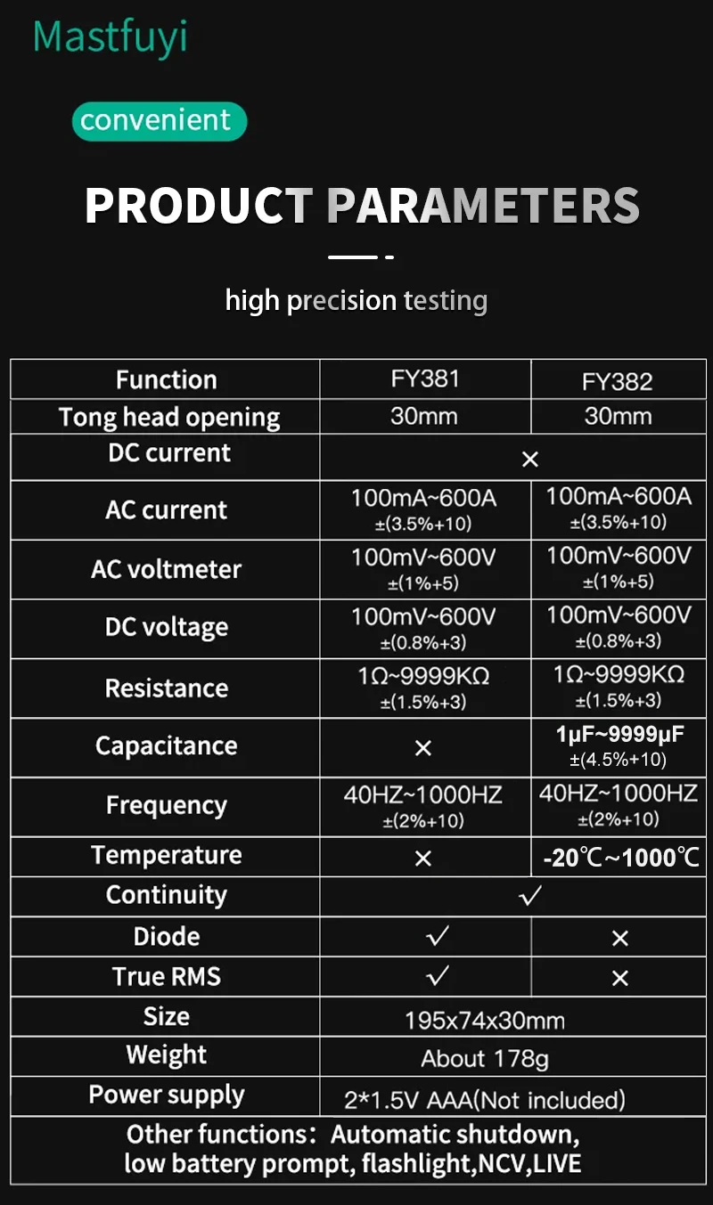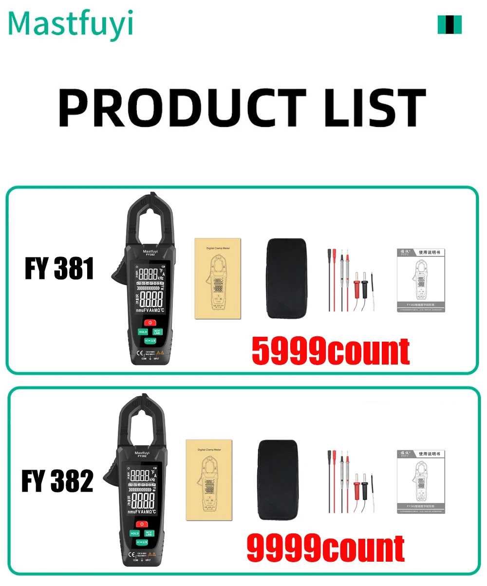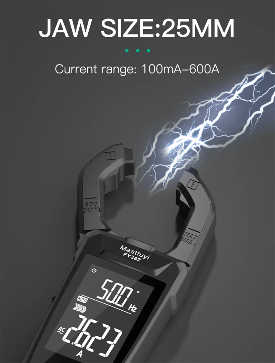 ●True RMS digital clamp meter with 9999 counts, wide measuring range and high accuracy. It can test AC current, AC voltage, DC voltage, temperature, capacitance, resistance, continuity, diode, frequency and live wire.