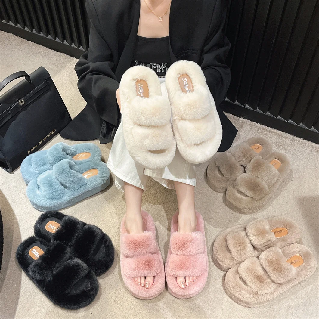 Color: Pink, Shoe Size: 36 - New Winter Open Toe Slipper Fur Thick Sole Flats Heel Ladies Casual Slip On Bedroom Shoes Soft Outdoor Fashion Fur Slippers
