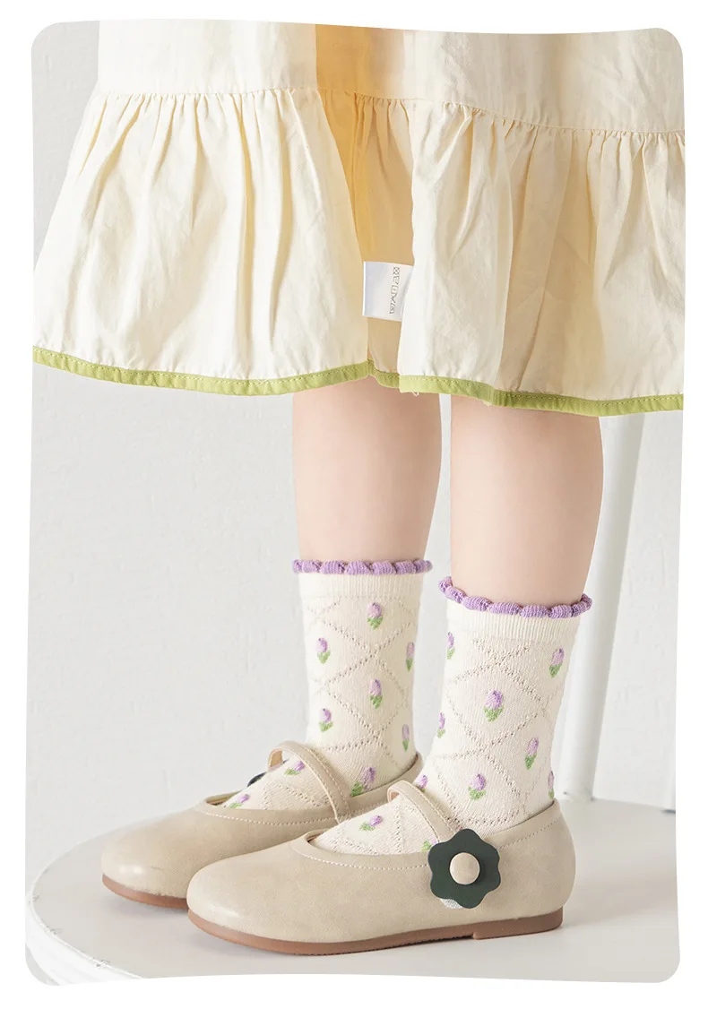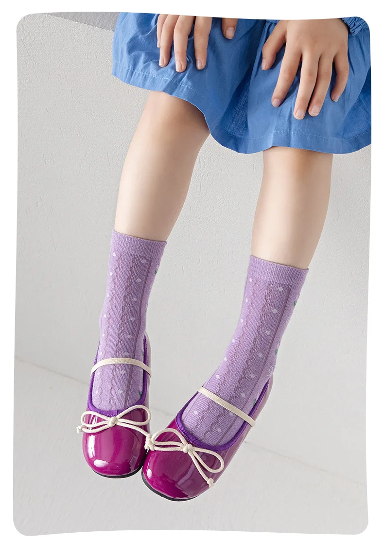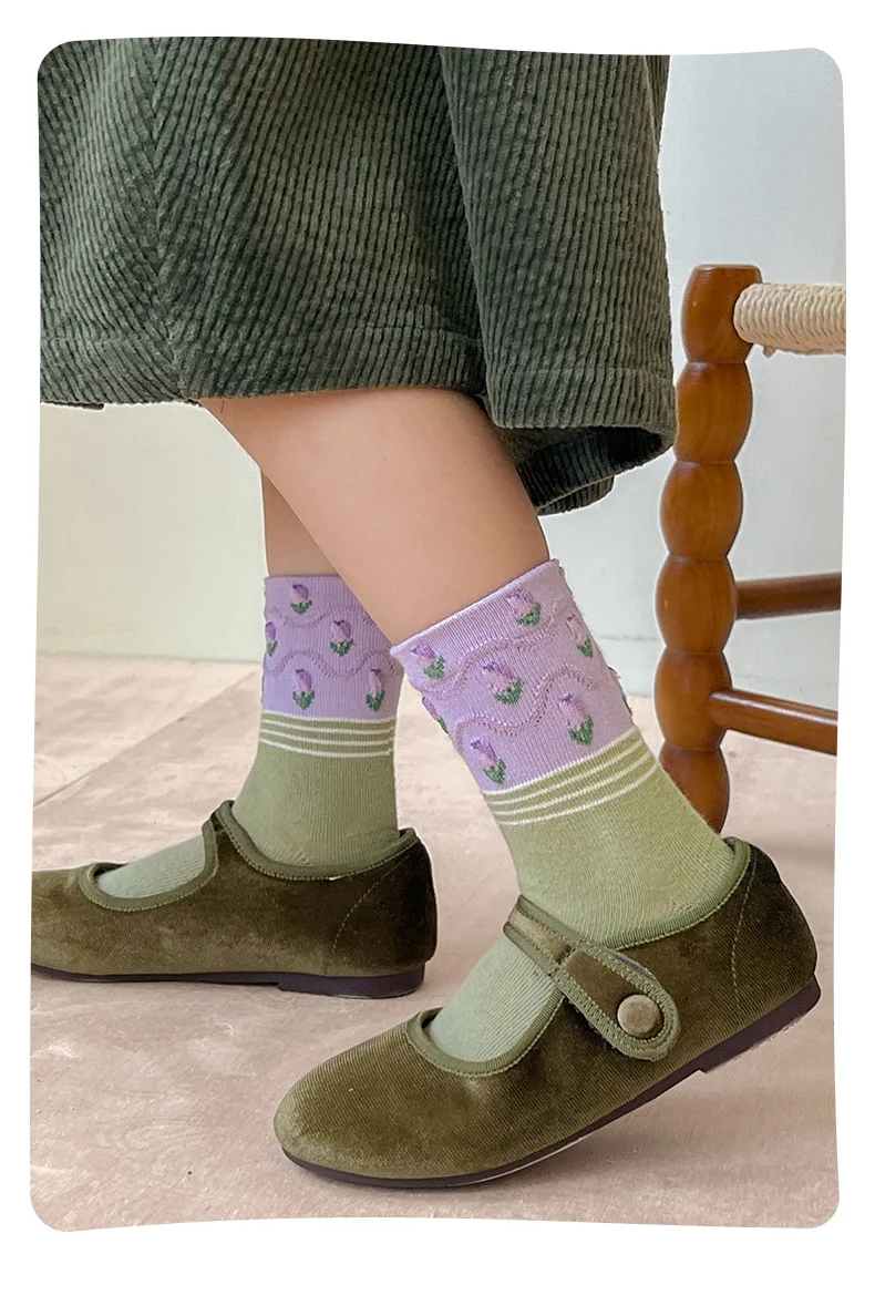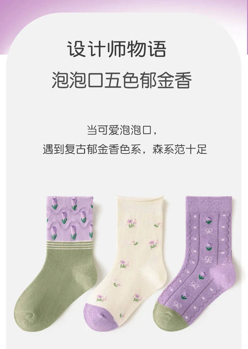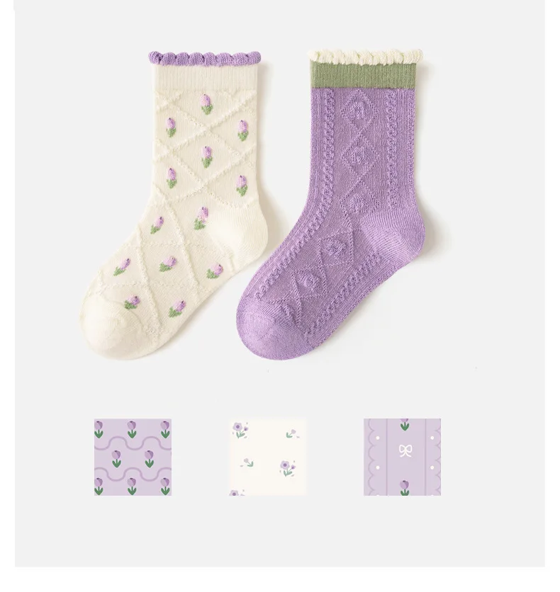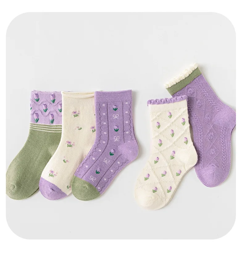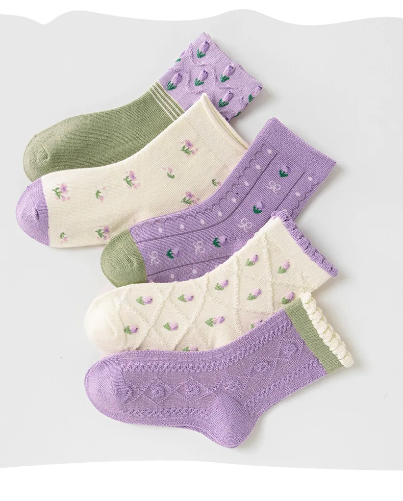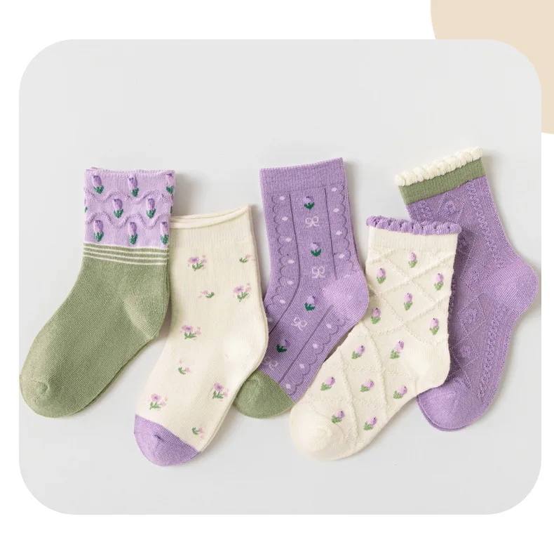 Color: Pink, Size: 10-12T - 5 pairs/lot Children's Socks Autumn Socks Girls Sweet Purple Floral Pattern Mid Calf Socks Baby Infant Cotton Socks
