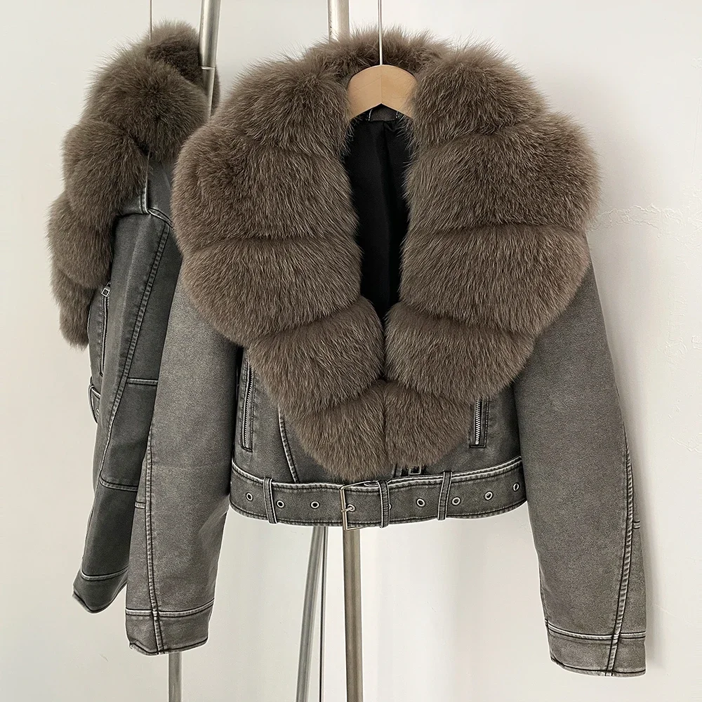 Color: Pink, Size: XS - Fake Leather Coat New Natural Fox Fur Autumn Short Faux Leather Jacket Female Spring PU Women Long Sleeve Real Fur Coat Thin