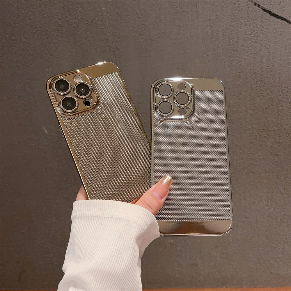 Color: PURPLE, Material: Microfiber - Luxury Plating Hollowed Out Case for iPhone 12 13 Mini 11 14 Pro Max X XR Xs Max 7 8 Plus Heat Dissipation Shockproof Lens Cover