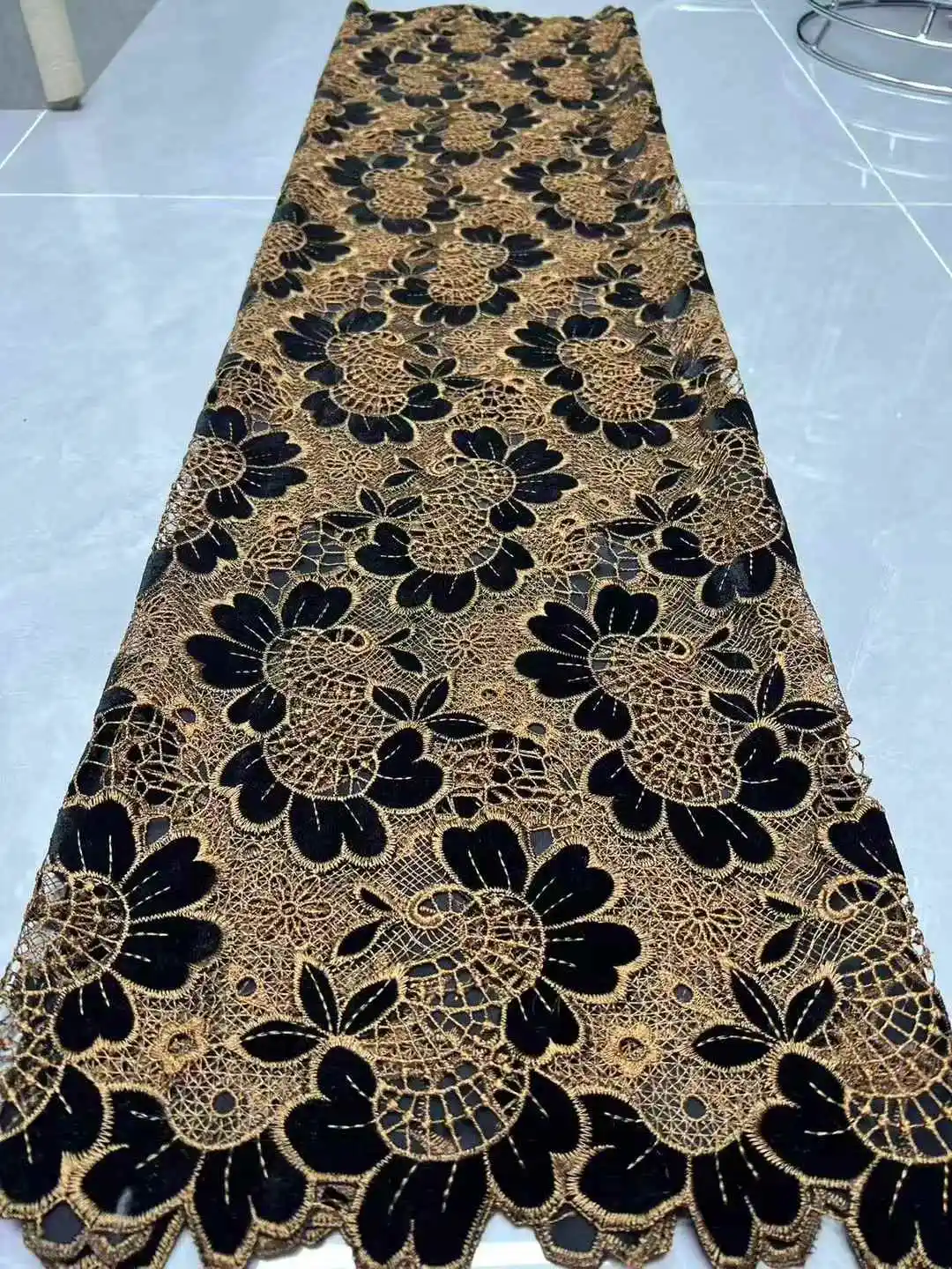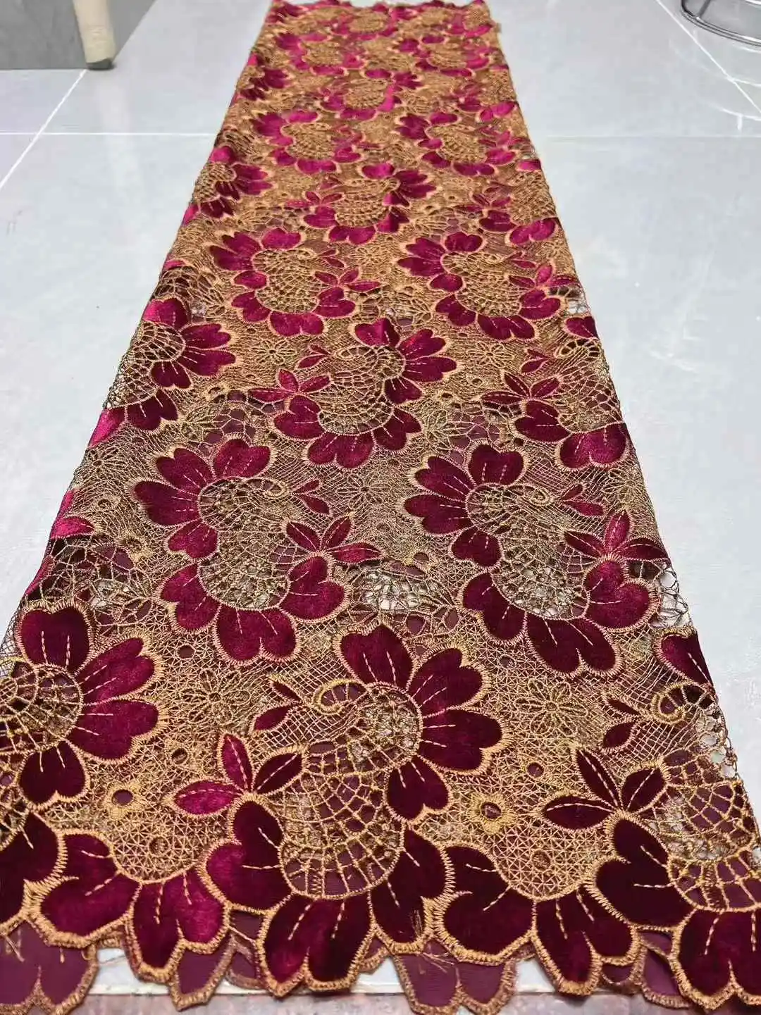 Originating from Nigeria, this velvet lace fabric brings a unique cultural flair to your sewing projects, offering a luxurious feel and aesthetic appeal.