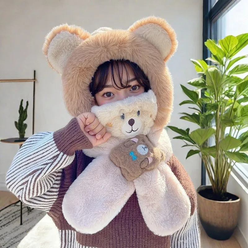 Color: Red - Winter Children One Piece Scarf Hat+Mask Cute Cartoon Baby Ear Protection Cap 1-6year Kids Plush Cross Neckerchief Warm Beanies