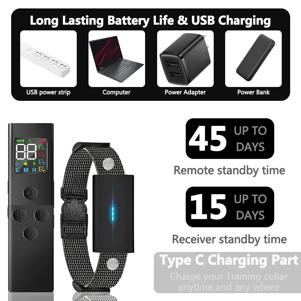 This device is ideal for training sessions, walks, or daily use to help prevent barking behavior. It’s easy to operate and provides customizable settings, so you can choose the level of correction that best suits your dog’s needs. The color screen display makes monitoring settings and battery life convenient, giving you full control over the training process.