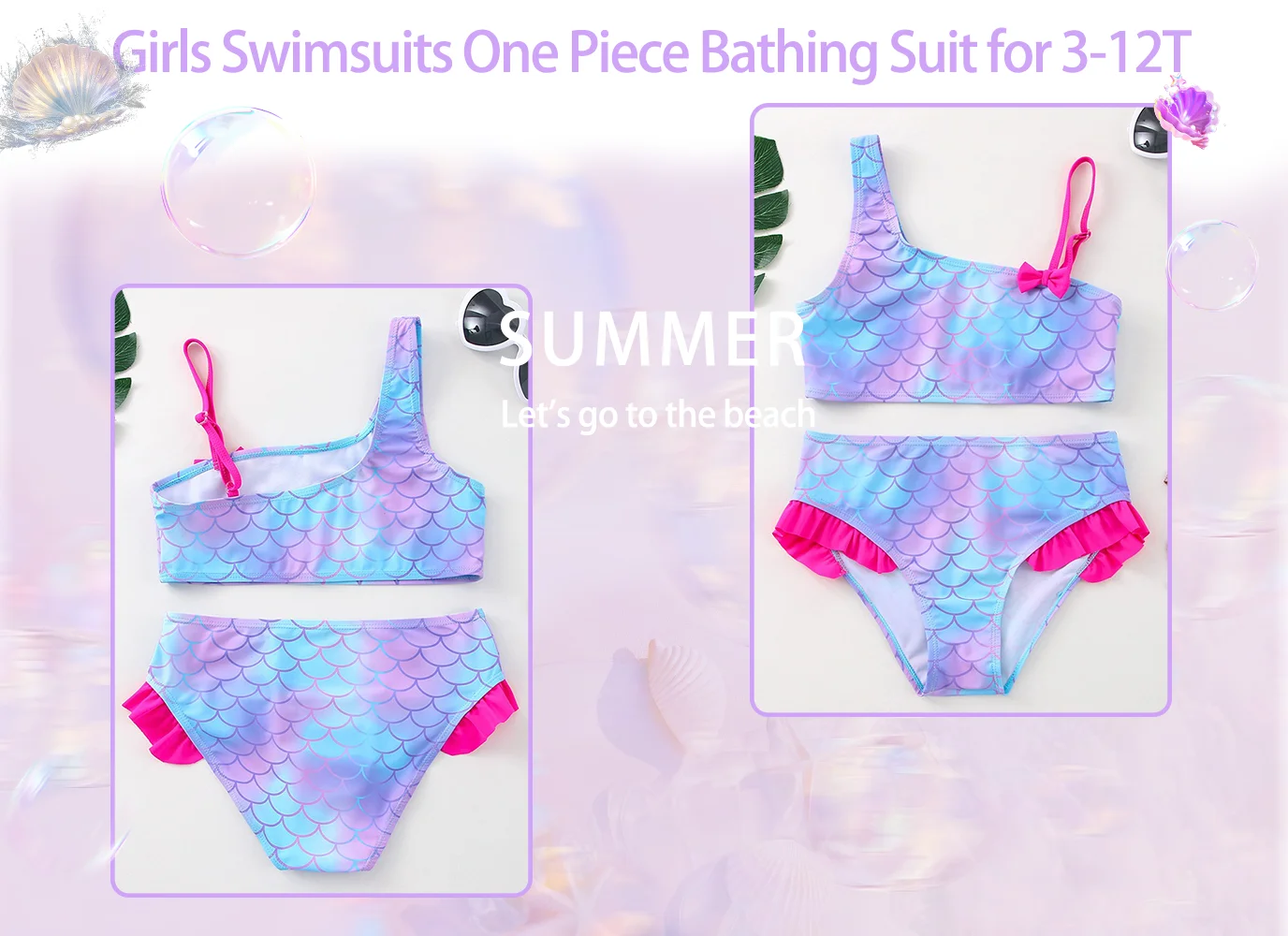 One-piece girls swimsuit, fish scales Designed with a cute ruffle hips.