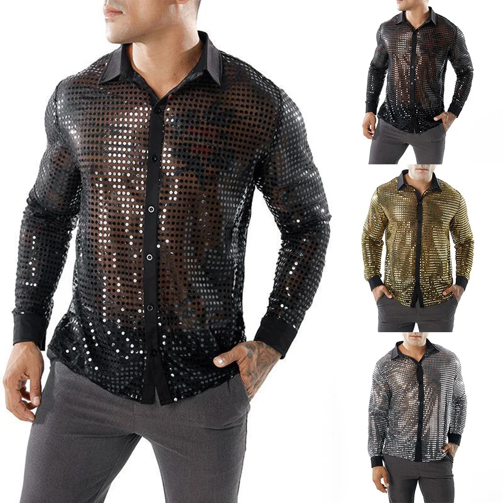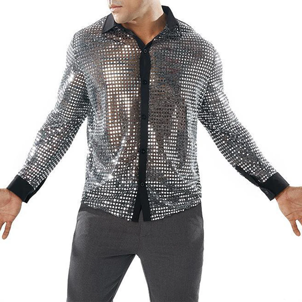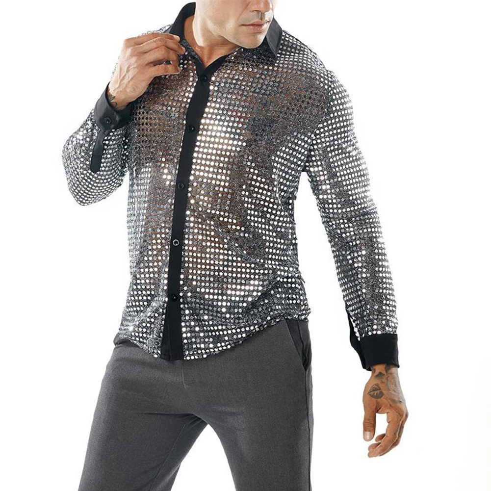 * Item Features:Mens ,Sparkly ,Sequins ,Party ,Dance, Long Sleeve ,Shirts, Retro 70s Disco ,Nightclub, Shirt, Tops