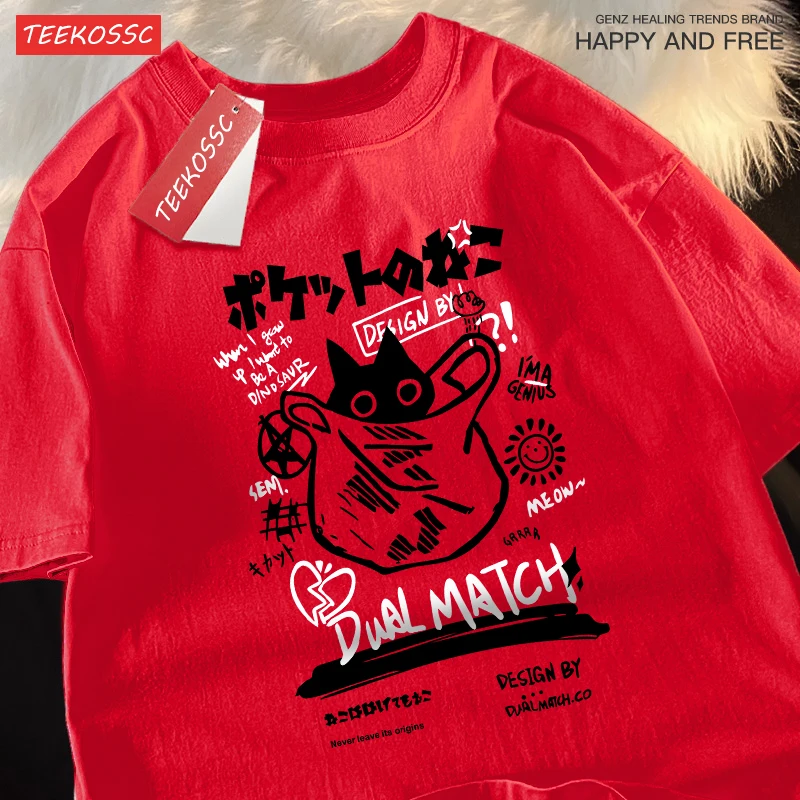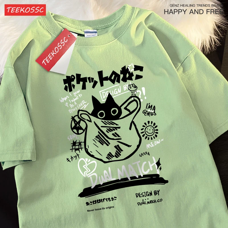 Color: SKY BLUE, Size: S - Japanese Fun And Cute Harajuku Cat Clothes Men Women Cotton Tops Creativity Casual T Shirts Cartoons Loose Couple Short Sleeve