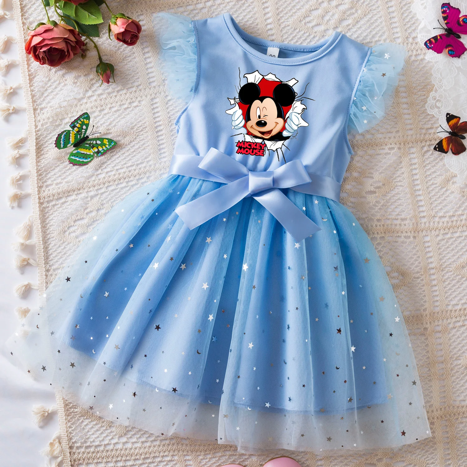 Color: SKY BLUE, Size: XL - Mickey Minnie Mouse Girls Summer Clothes Flying Sleeves Bow Sequin Dress 2-6Y Kid Birthday Tutu Princess Dress for Baby Girl