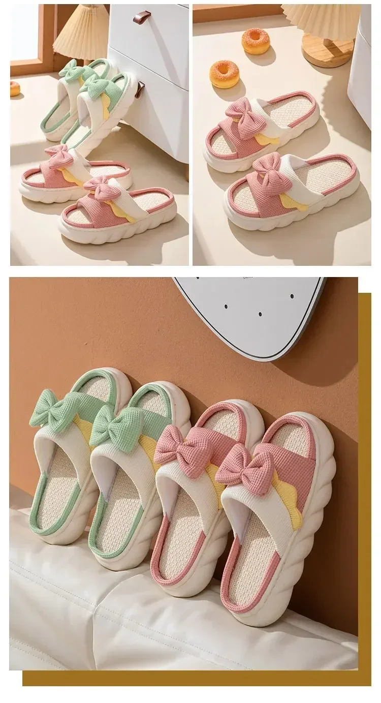 Color: Straw, Shoe Size: 38 - Linen Slippers Women Indoor Slippers Comzy Anti-Slip House Cotton Shoes Cute Bowknot Flat Slipper Couples Slides Spring Summer