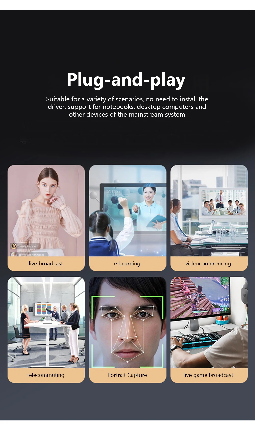 It is mainly used for live broadcasting and online classes, which requires manual focusing and cannot be autofocused