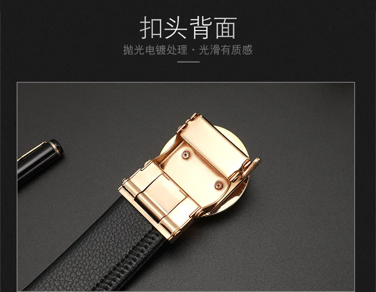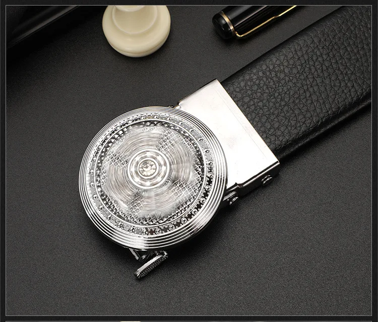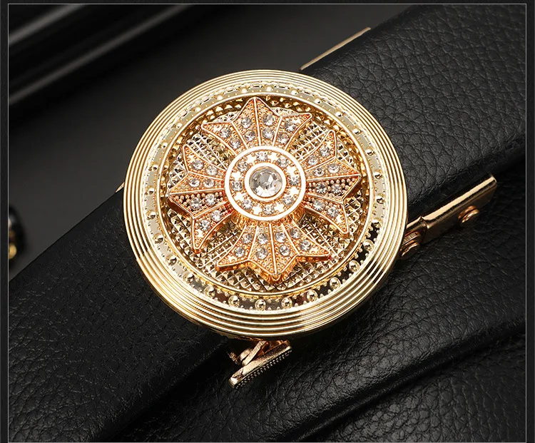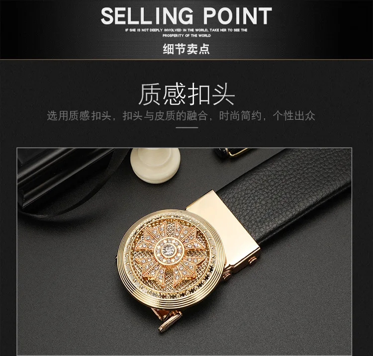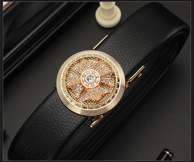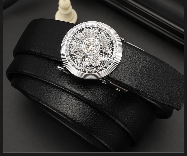 Color: WHITE, Belt Length: 110cm - Man PU Leather Belt High Quality Men Business Belt Golden Automatic Buckle Waist Buckle Rhinestone Decoration Males Luxury Belt